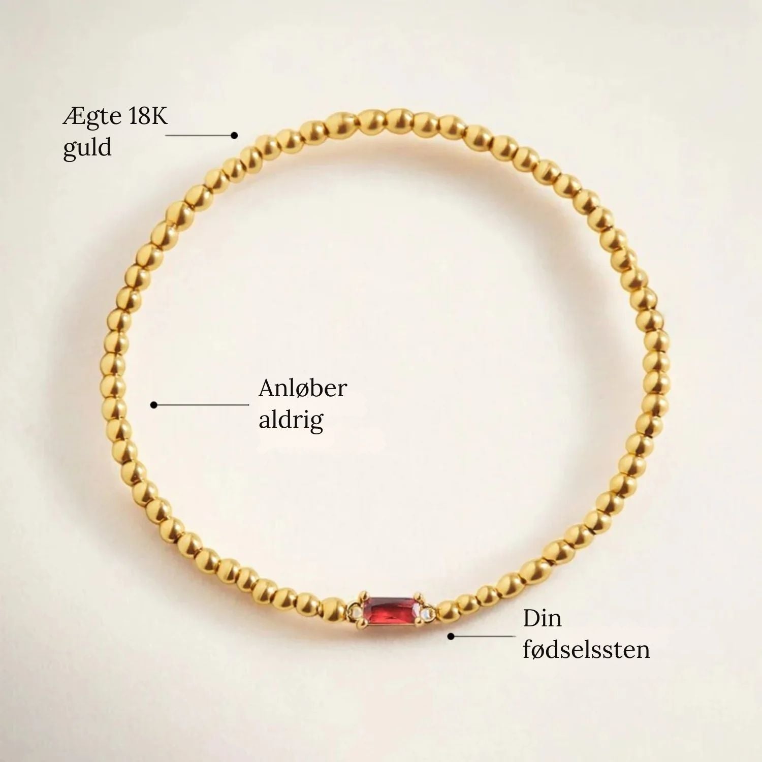 Et raffineret og symbolsk armbånd, sammensat af gyldne perler fremhævet af en funklende fødselssten. Et elegant smykke — perfekt som gave eller til at fejre din fødselsmåned, alene eller i stacking.