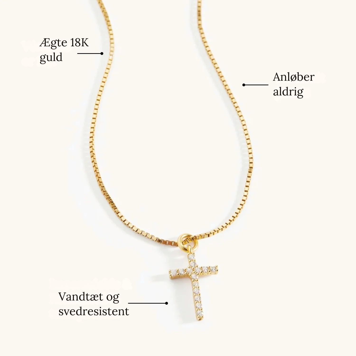 En halskæde, der forener elegance og spiritualitet. Det pavébesatte korsvedhæng fanger lyset på en betagende måde og tilfører et strejf af glamour til dette tidløse symbol på tro og beskyttelse.