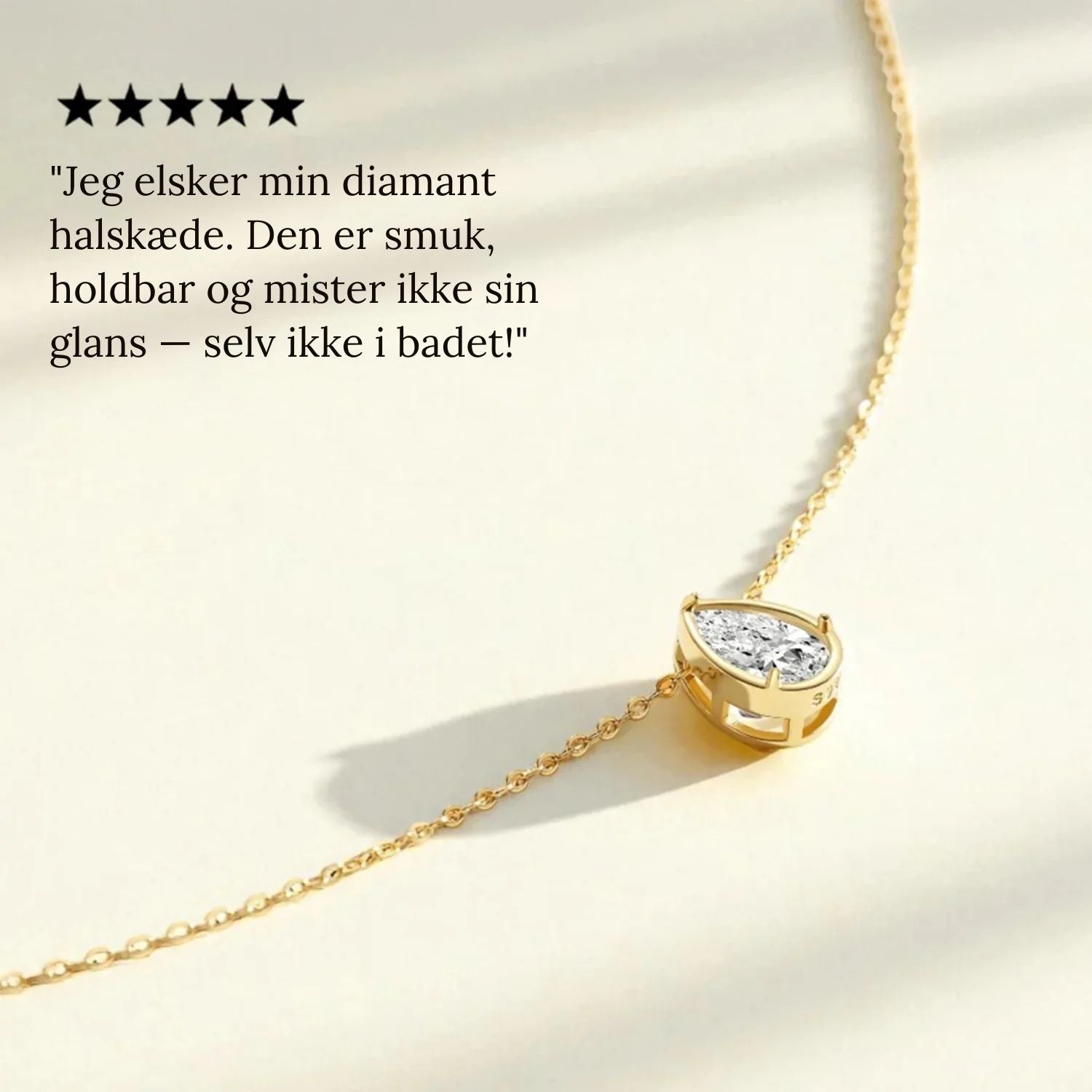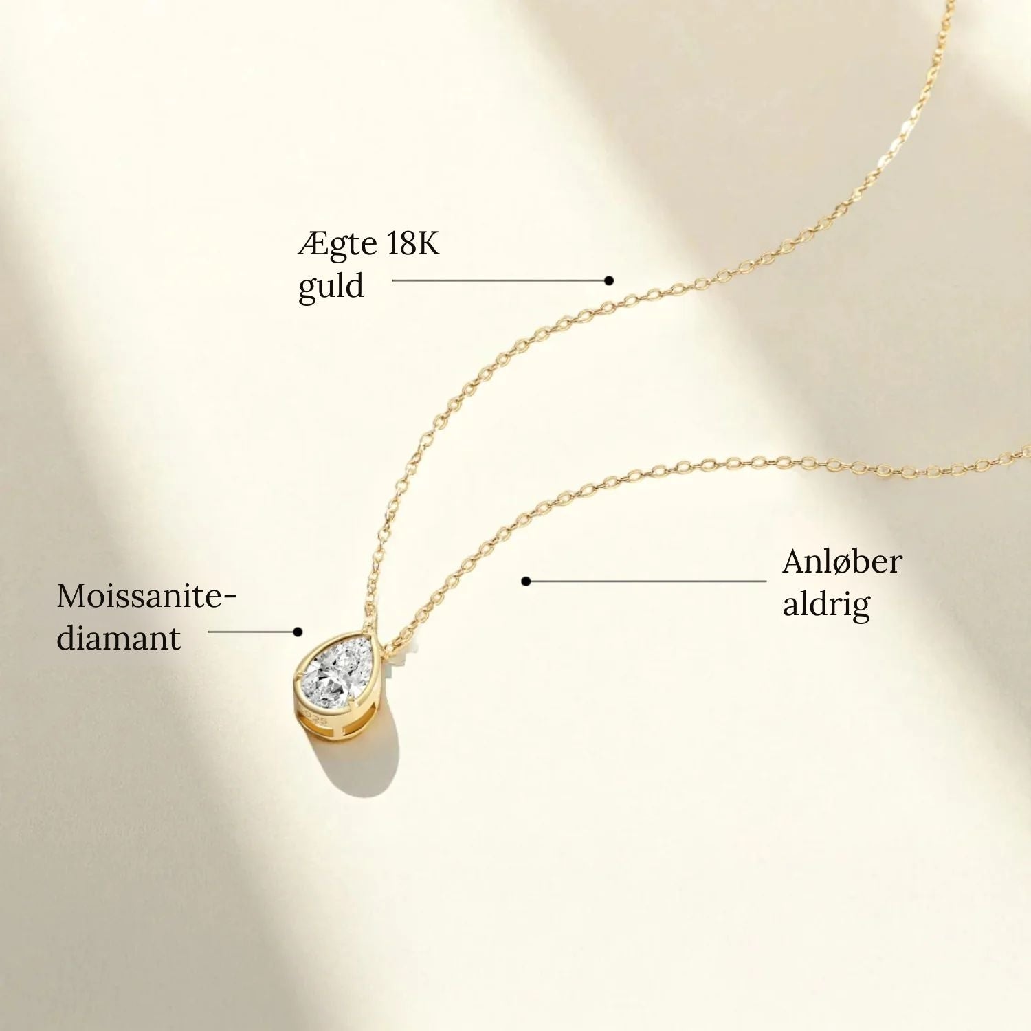 En delikat og tidløs halskæde prydet med et dråbeformet vedhæng i moissanit, der fanger lyset ved hver bevægelse. Raffineret og elegant — smuk alene for et subtilt skær eller lagdelt for et mere dristigt udtryk. Et smykke med stille skønhed, der aldrig går ubemærket hen.