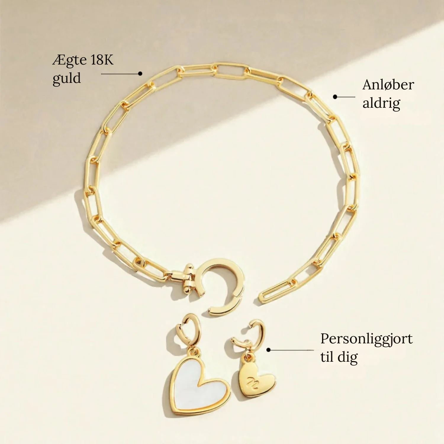 Et delikat smykke, hvor elegance møder et personligt præg. Det iriserende perlemorsvedhæng formet som et hjerte fremhæves af en valgfri initiale, der gør armbåndet unikt og meningsfuldt.