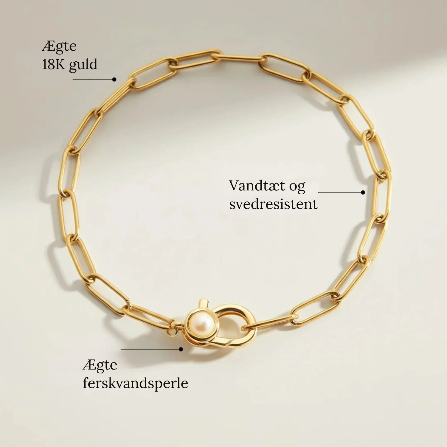 Et armbånd hvor modernitet og elegance mødes. Den rektangulære kæde fremhæves af en delikat ferskvandsperle, som skaber en perfekt balance mellem nutidigt design og tidløs raffinement. Bær det alene for et chic udtryk eller i stacking for en mere trendy stil.