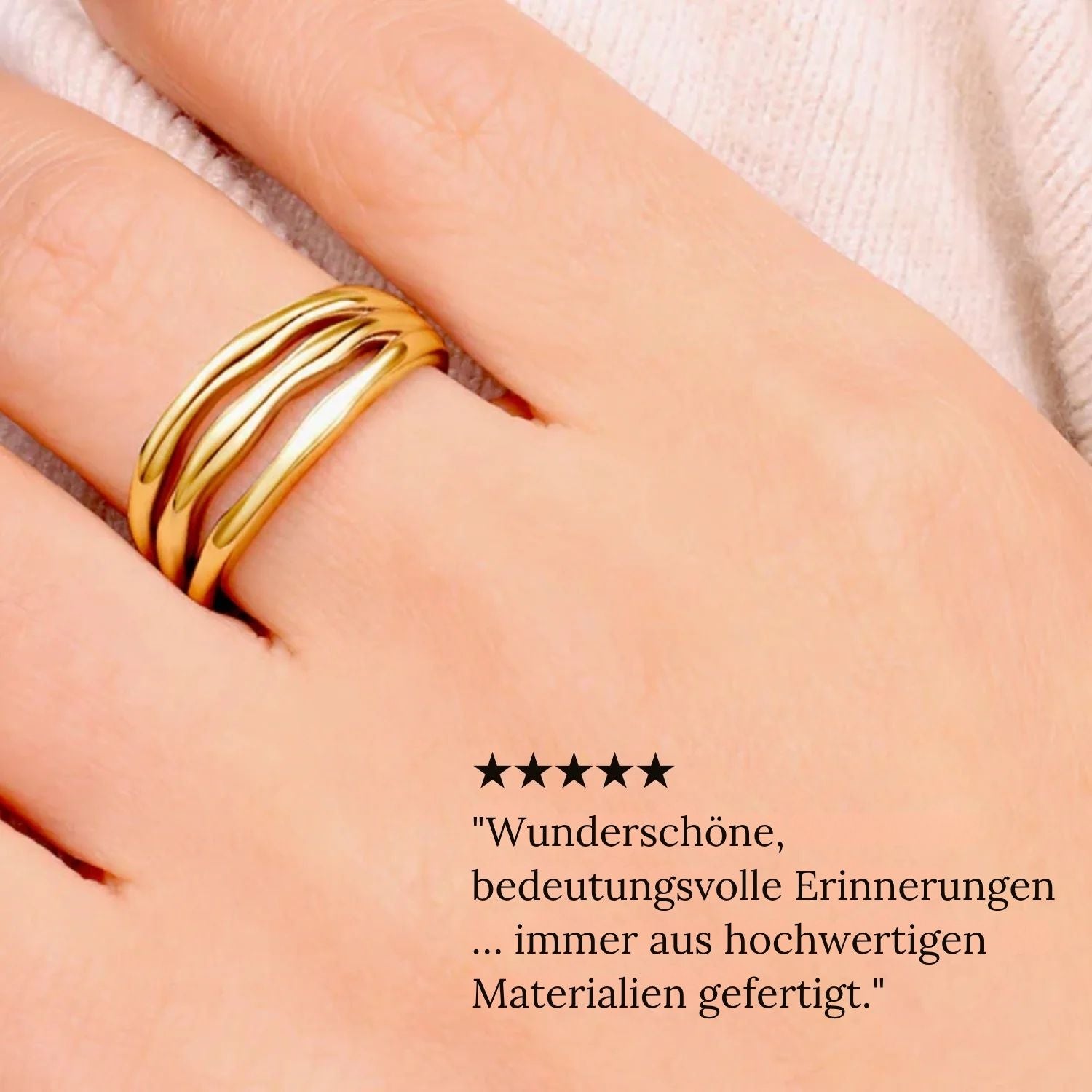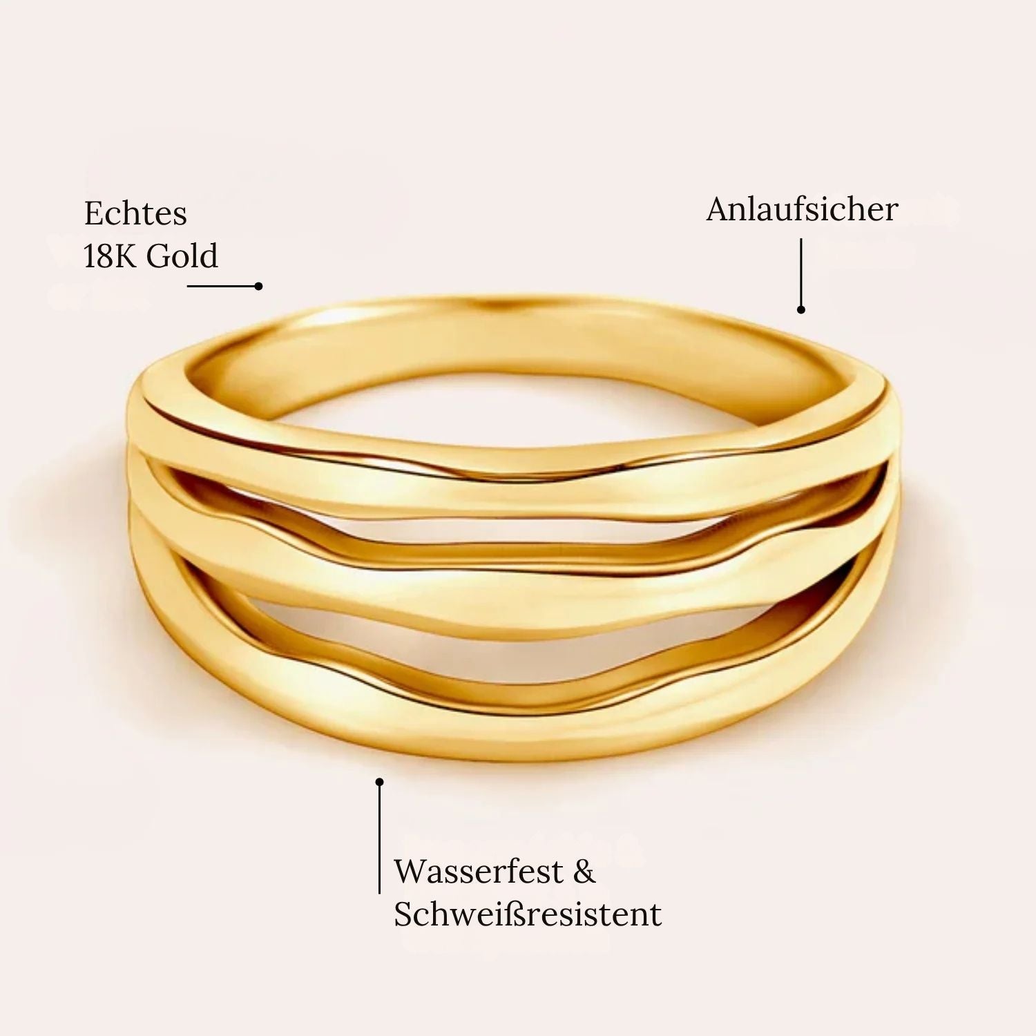 Ein kühner und raffinierter Ring, perfekt, um Ihre Alltagsoutfits zu veredeln oder bei besonderen Anlässen zu glänzen. Sein dreifaches Band vereint klassische Eleganz mit einem modernen Touch – ein vielseitiges und zeitloses Schmuckstück.