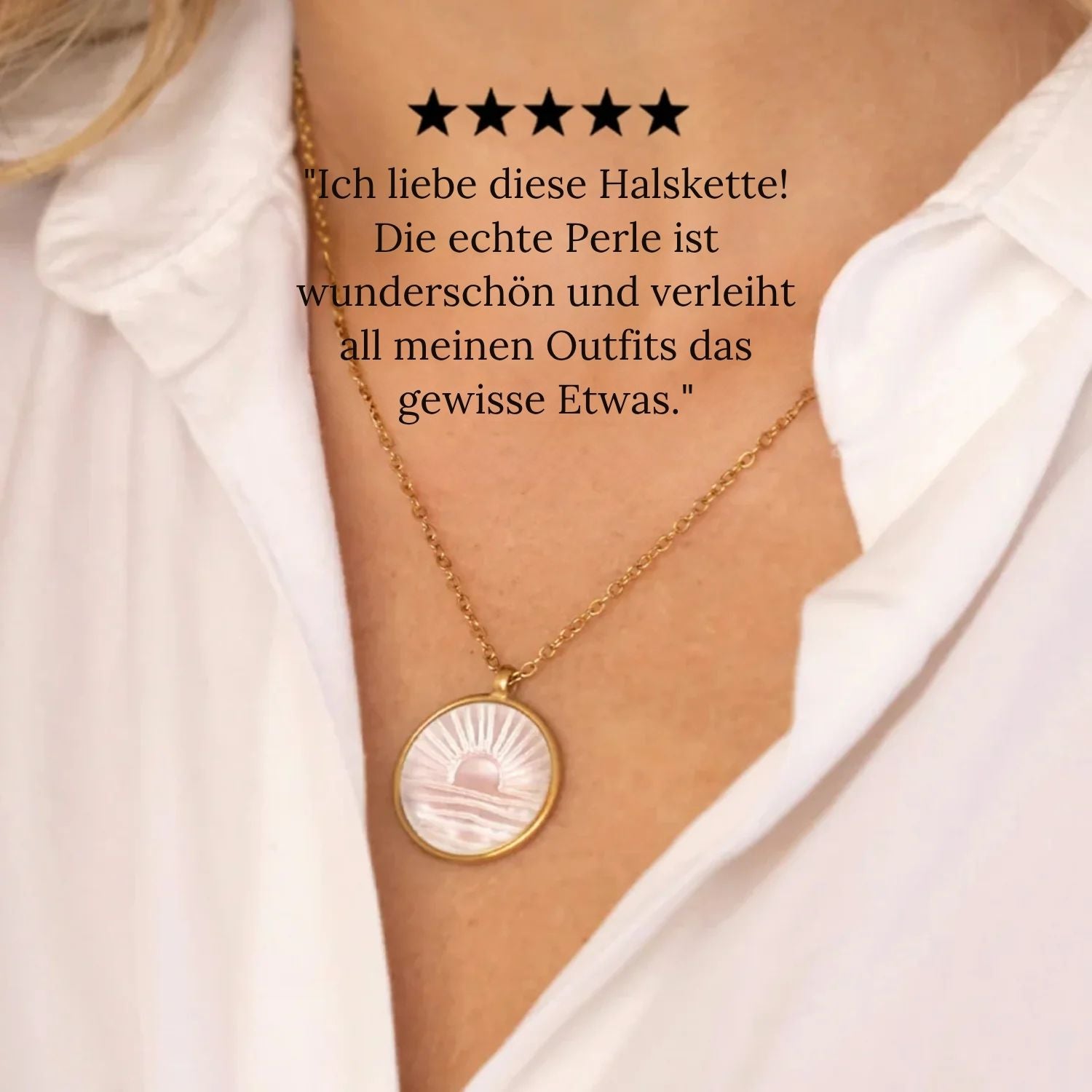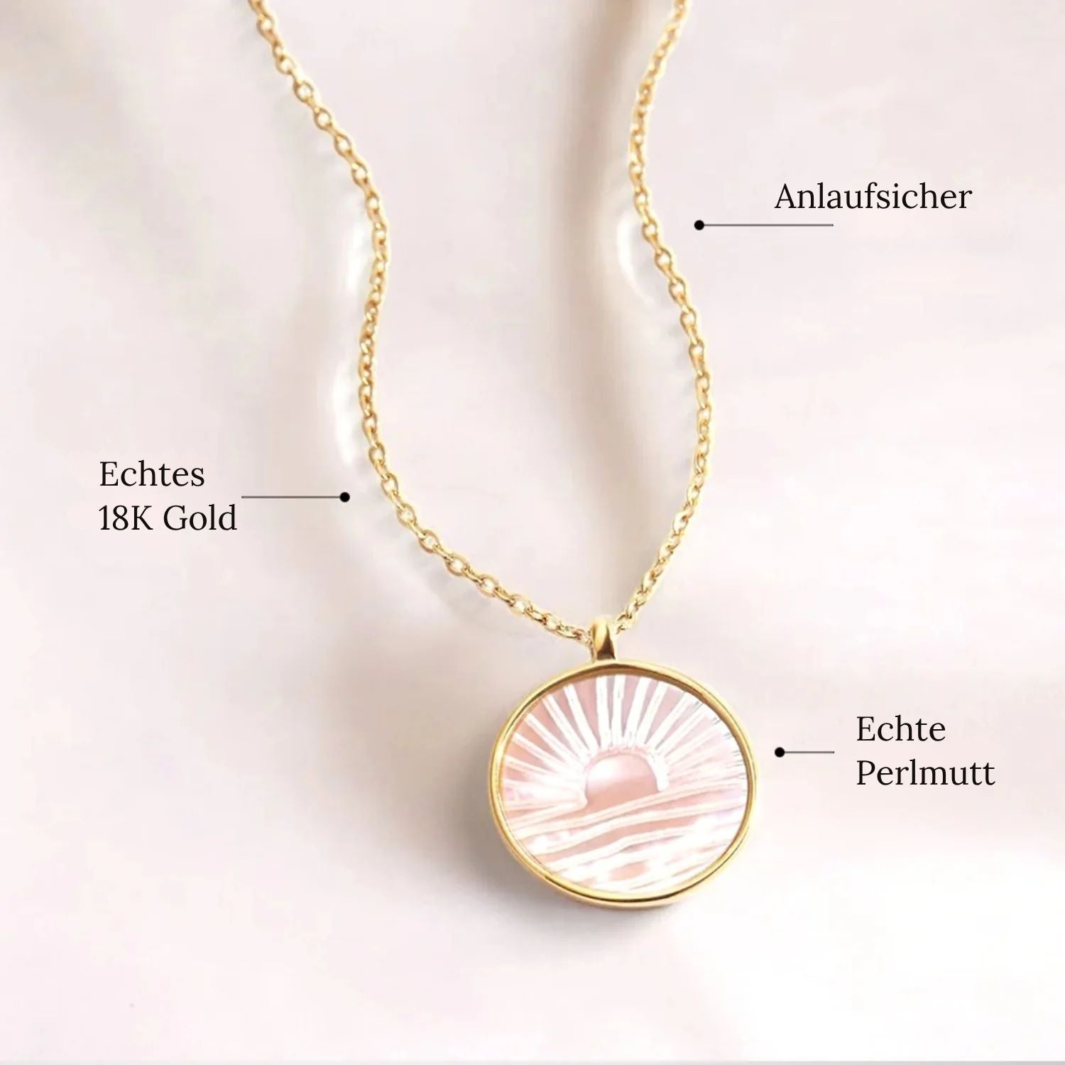 Ein strahlender Anhänger, der die Schönheit eines Sonnenaufgangs einfängt. Das schimmernde Perlmutt reflektiert das Licht und symbolisiert Neuanfänge – ein inspirierendes und elegantes Schmuckstück.