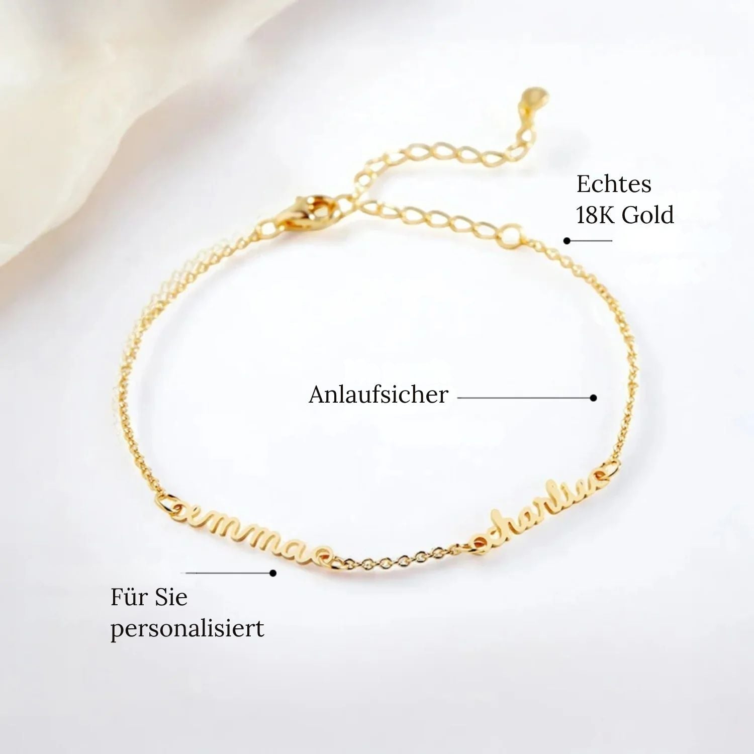Eine personalisierte Note voller Eleganz. Das zarte Armband mit mehreren Namen ermöglicht es Ihnen, Ihre Liebsten immer bei sich zu tragen – stilvoll, dezent und bedeutungsvoll. Allein getragen oder in Kombination sorgt es für einen raffinierten und emotionalen Look.