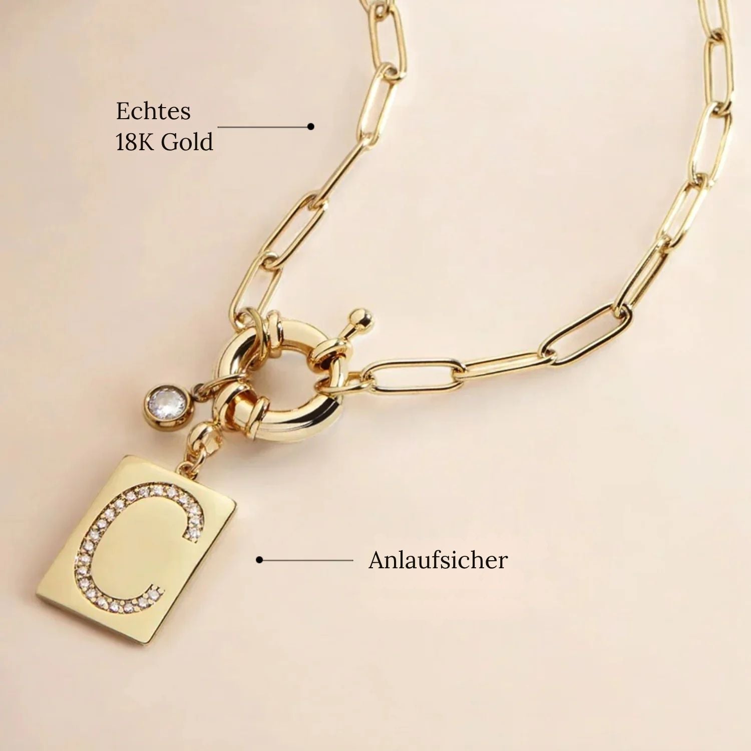 Ein personalisiertes Schmuckstück mit modernem Stil. Der mit funkelnden Steinen besetzte Initialenanhänger kombiniert sich mit einer eleganten Gliederkette zu einem perfekten Gleichgewicht zwischen Eleganz und Trend. Solo getragen wirkt er edel – im Layering setzt er ein starkes Statement.