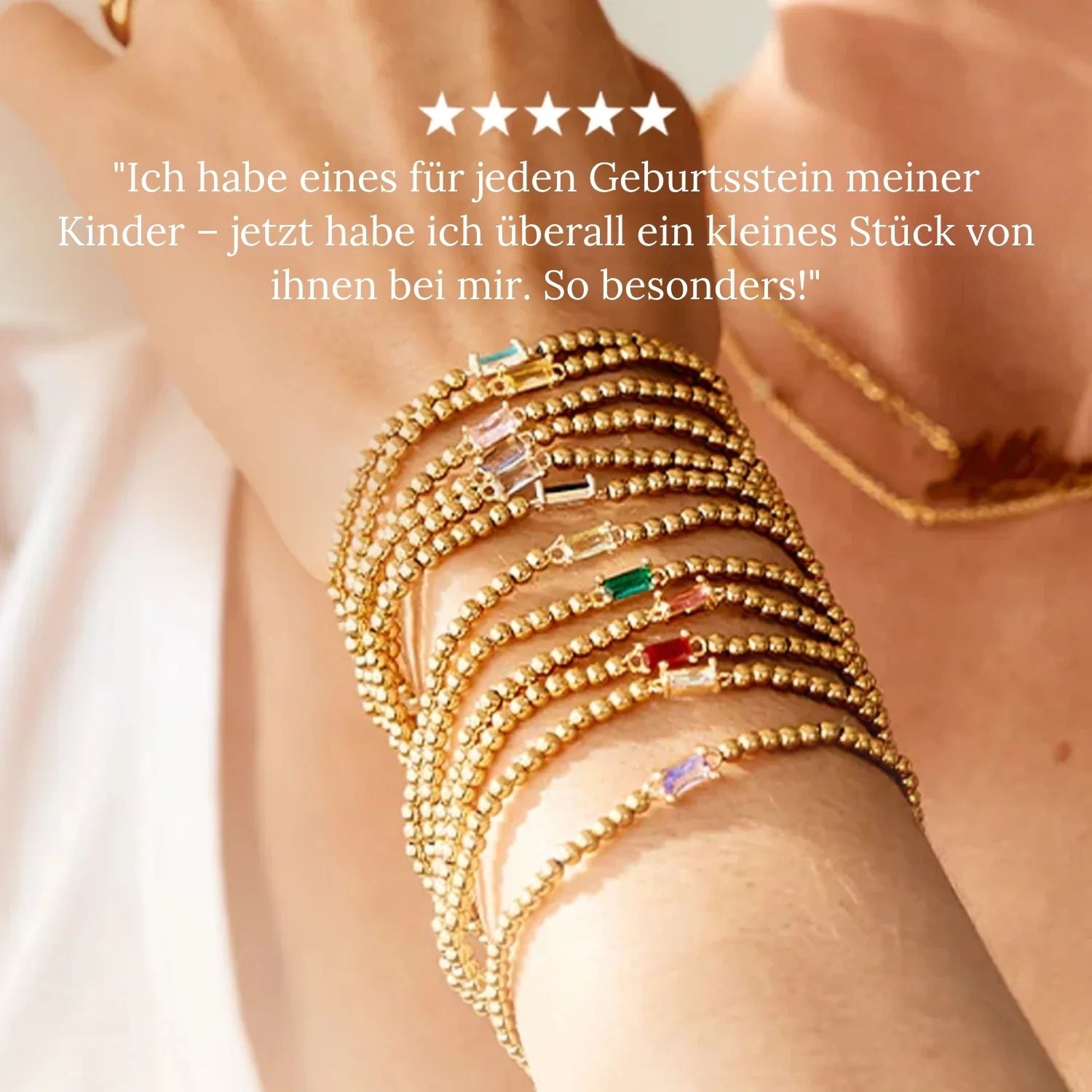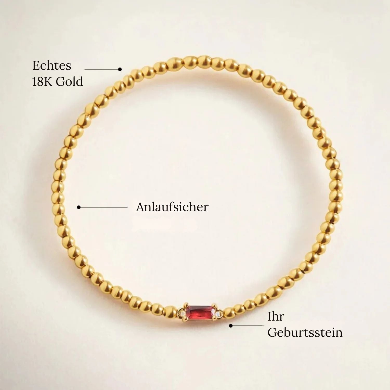 Ein raffiniertes und symbolisches Armband aus goldfarbenen Perlen, veredelt mit einem funkelnden Geburtsstein. Ein elegantes Schmuckstück zum Verschenken oder Tragen – zur Feier Ihres Geburtsmonats, einzeln oder in Kombination getragen.