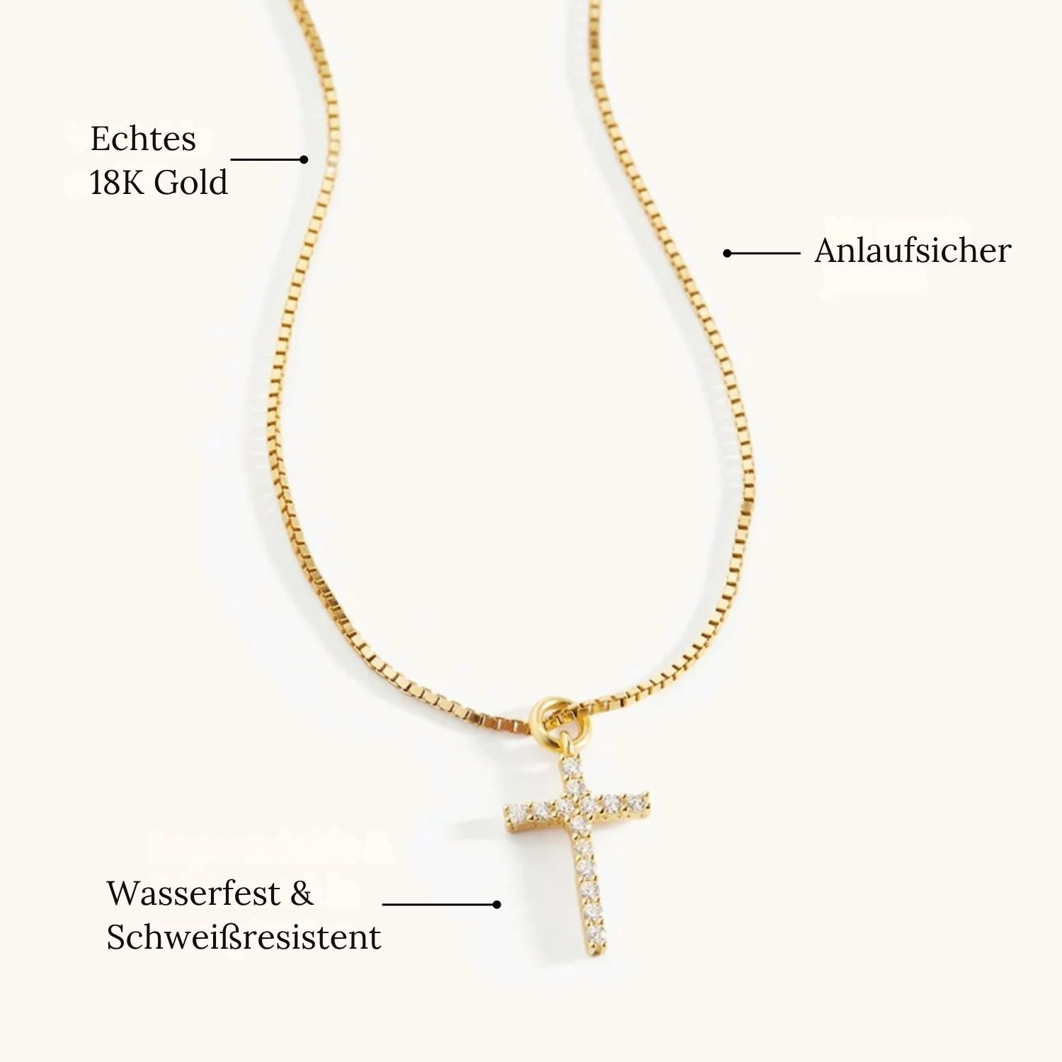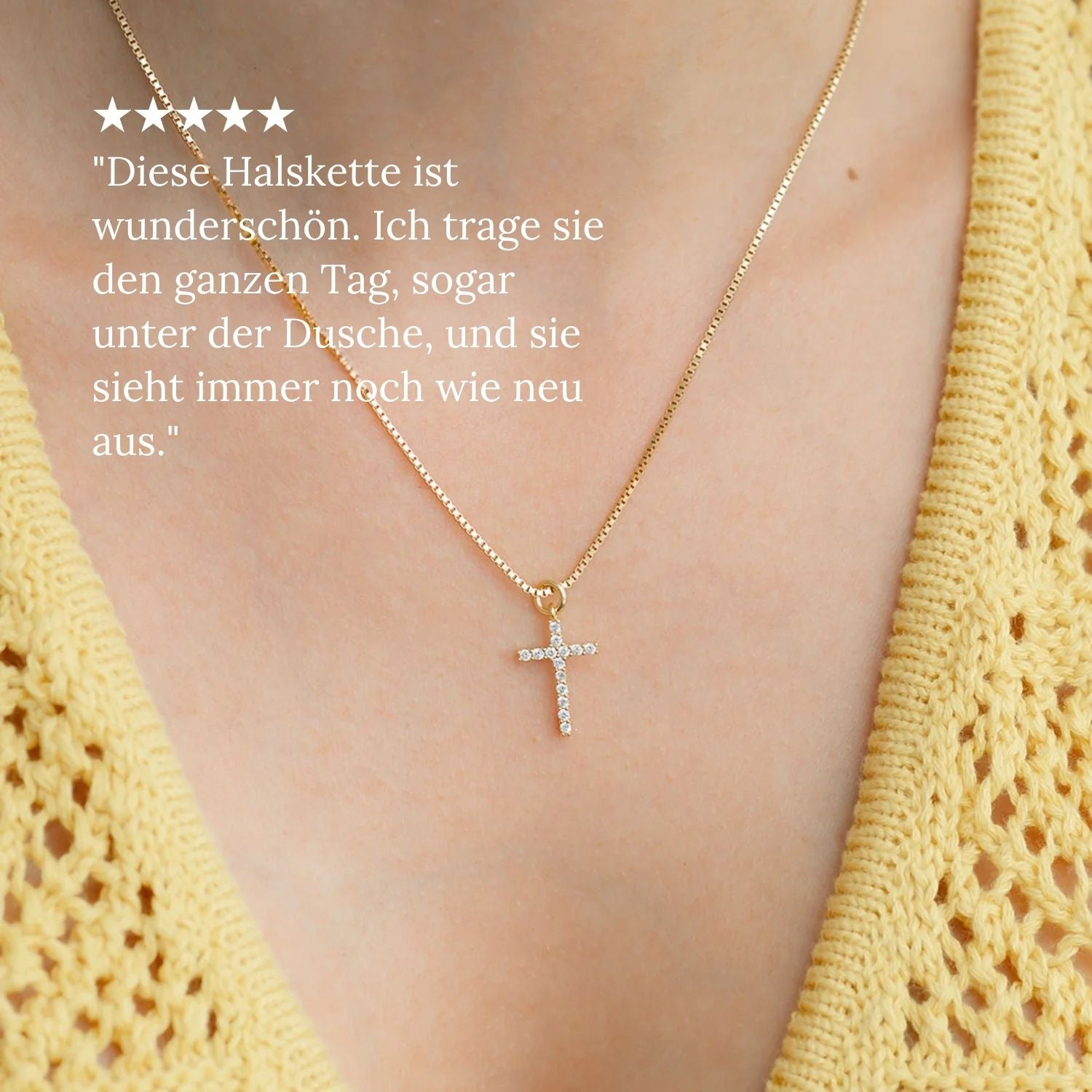 Eine Halskette, die Eleganz und Spiritualität vereint. Ihr Kreuzanhänger, besetzt mit funkelnden Pavé-Steinen, fängt das Licht auf wunderschöne Weise ein und verleiht diesem zeitlosen Symbol des Glaubens und des Schutzes einen Hauch von Glamour.