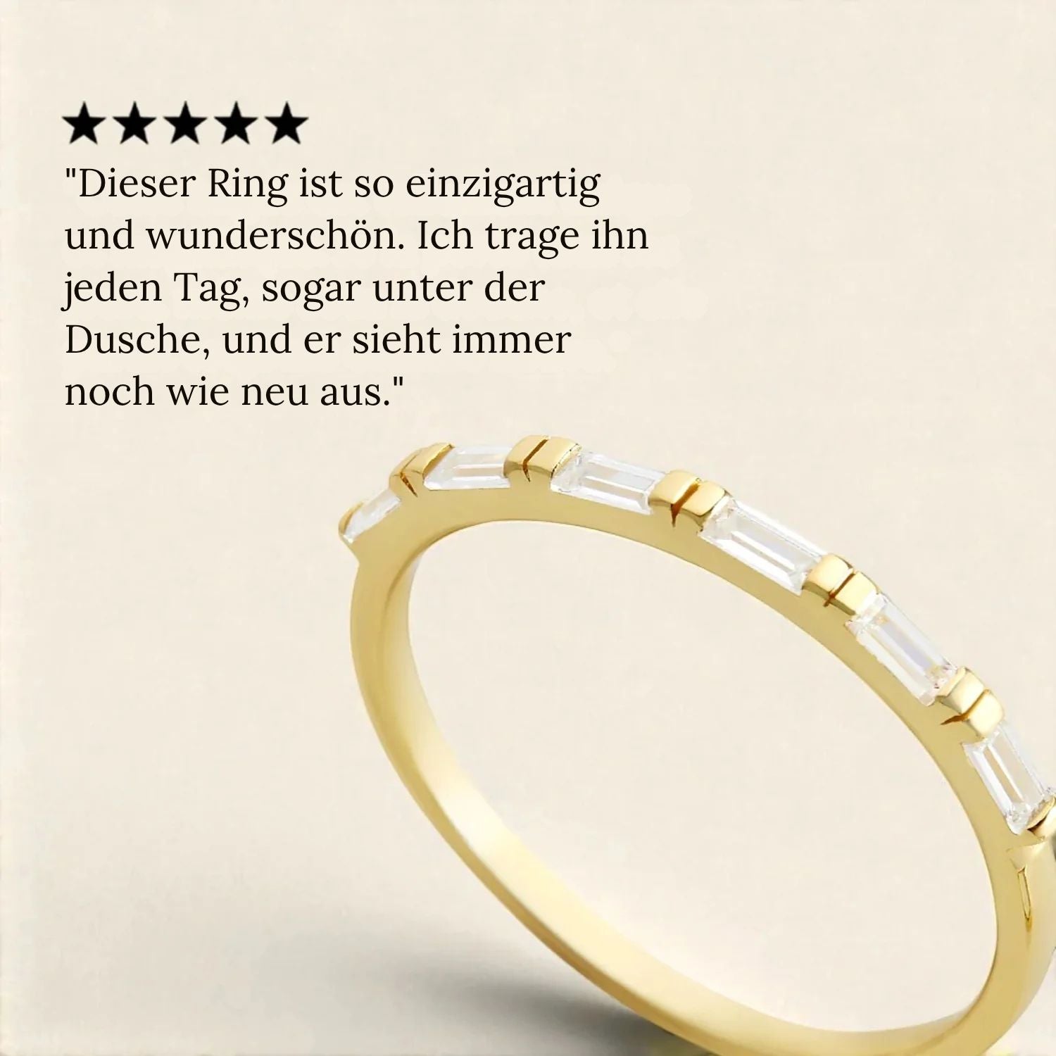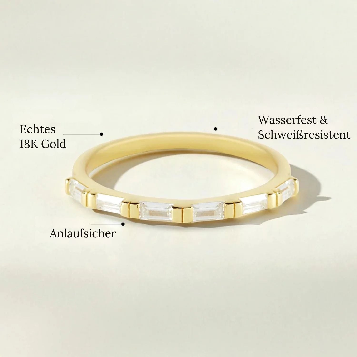 Ein raffinierter Ring mit minimalistischem Design, veredelt durch den zeitlosen Glanz funkelnder Steine. Elegant und anspruchsvoll – er kann einzeln für einen dezenten Look oder in Kombination für mehr Glamour getragen werden.