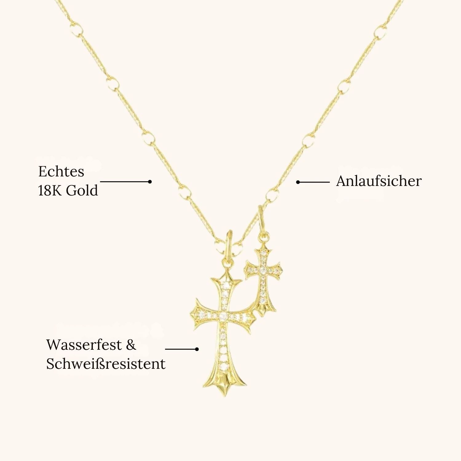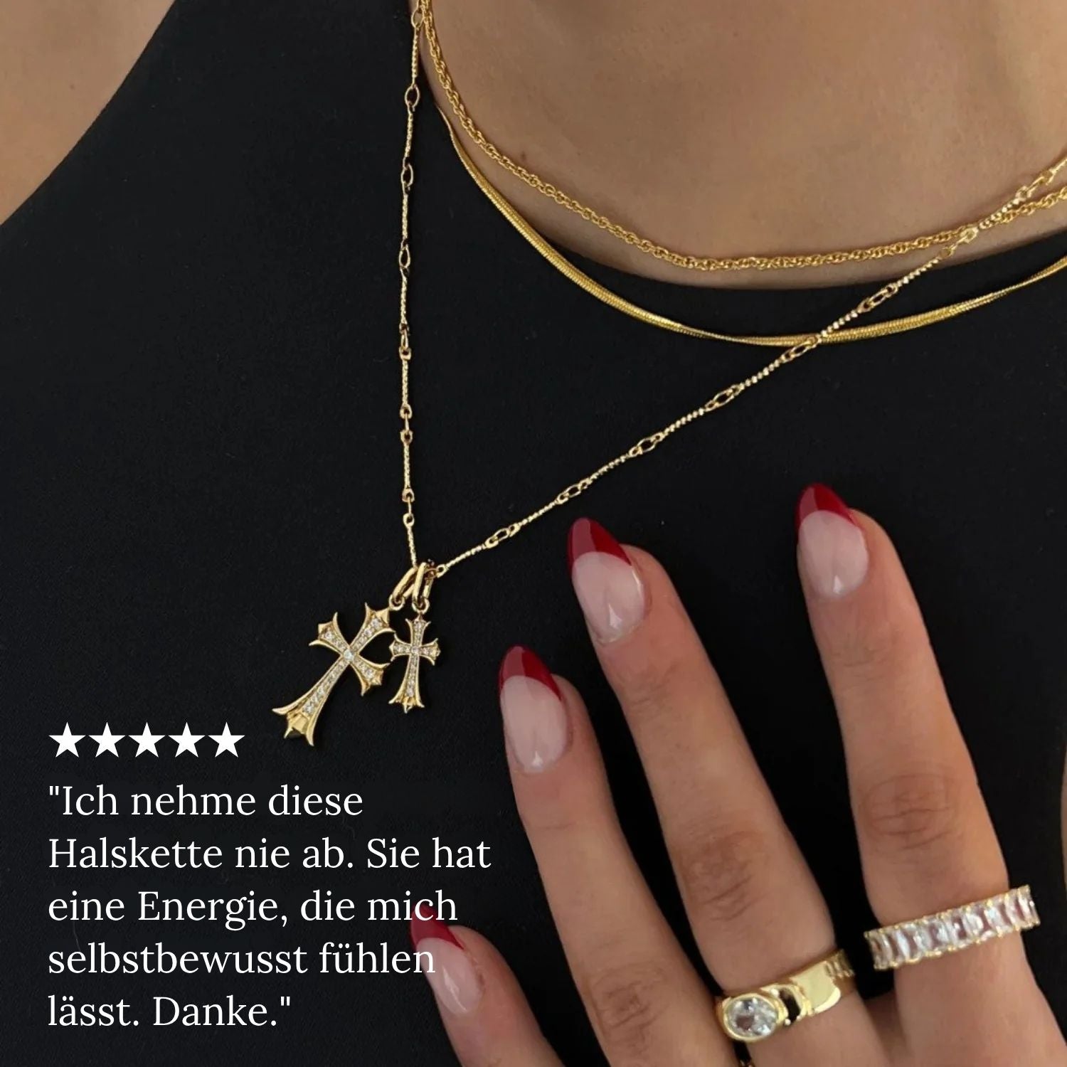 Eine ikonische Halskette mit einem auffälligen Design, das auf TikTok viral gegangen ist. Der doppelte Kreuzanhänger verkörpert zugleich Eleganz und Mut, veredelt durch eine feine Stabkette, die einen modernen und raffinierten Touch verleiht. Ein hypoallergenes Schmuckstück, frei von Blei und Nickel – perfekt für jeden Anlass.