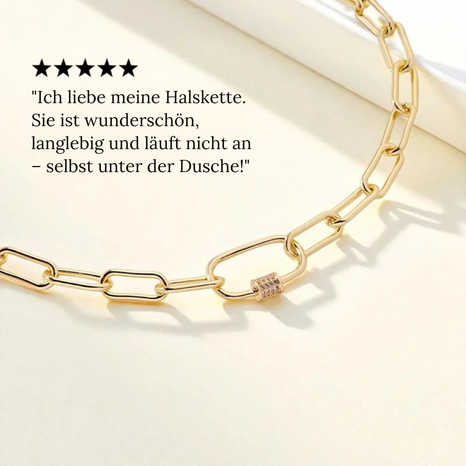 Ein perfektes Gleichgewicht zwischen Kühnheit und Eleganz. Diese Gliederkette besticht durch ihren mit funkelnden Steinen verzierten Karabiner, der Sicherheit und Stil vereint. Mit ihrem markanten goldenen Glanz verkörpert sie alltäglichen Luxus, der Licht und Blicke auf sich zieht.
