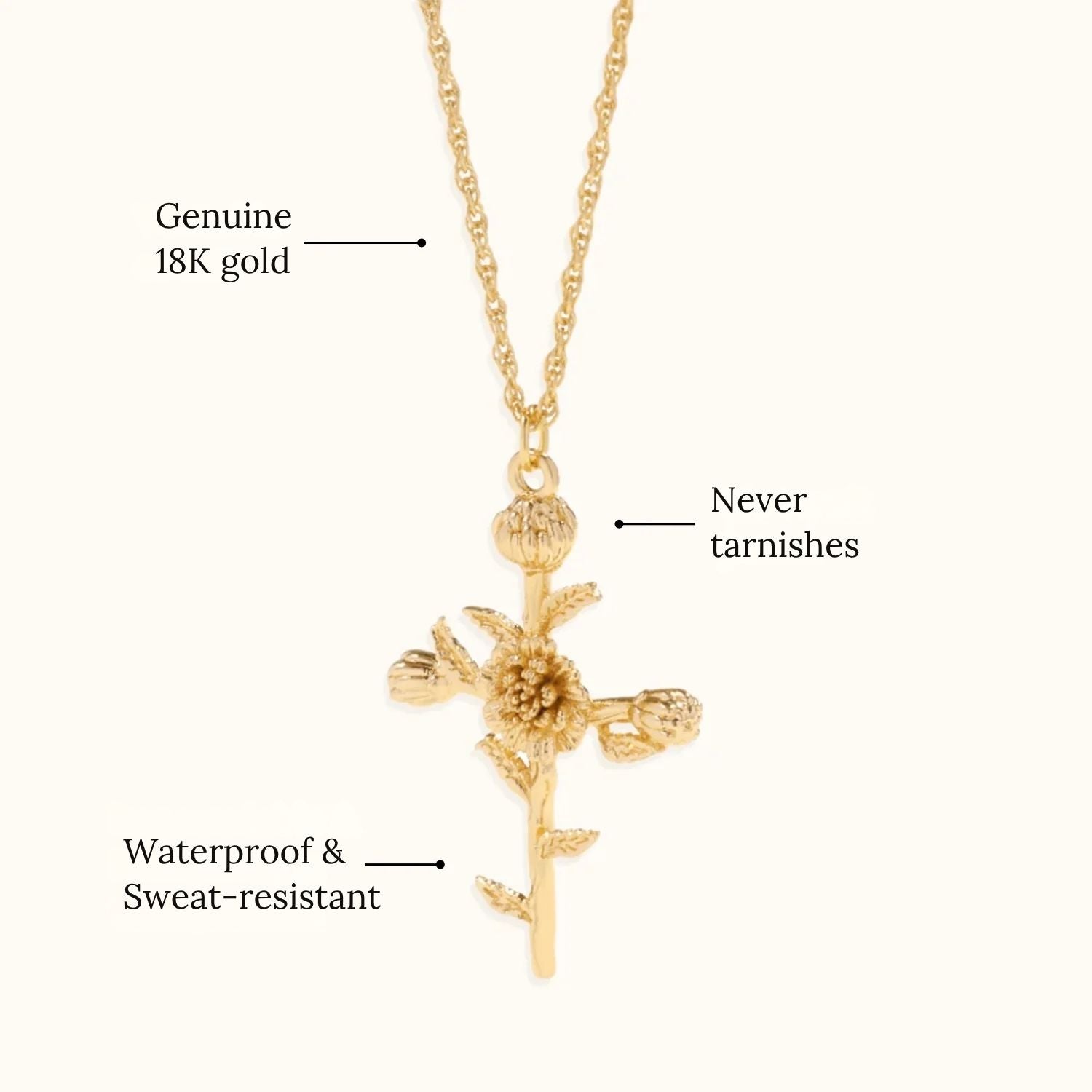 A necklace filled with elegance and symbolism. Its finely detailed floral cross pendant represents growth and renewal, creating a piece that is both spiritual and refined.