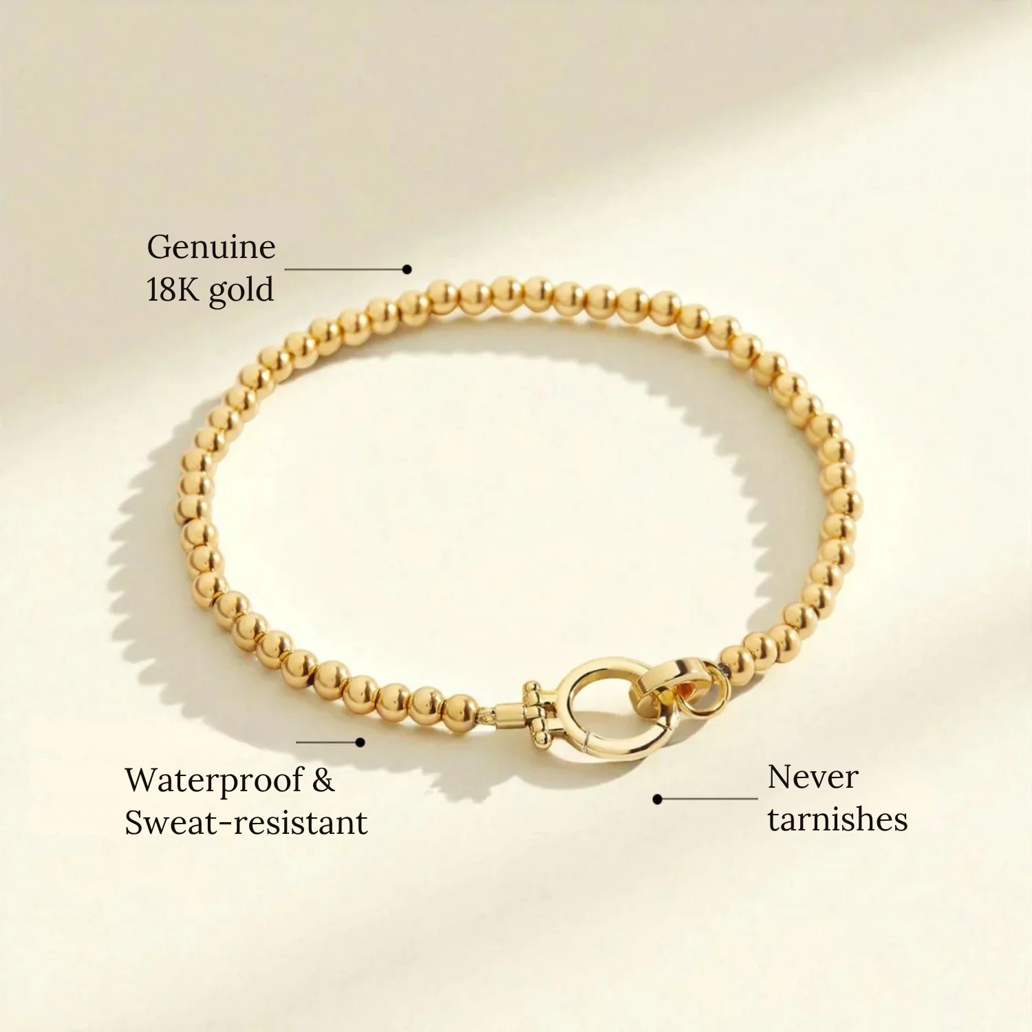 A delicate and timeless bracelet made of golden beads, enhanced by a charming, refined clasp. Wear it alone, personalize it with your favorite charms, or stack it for a unique and elegant look.