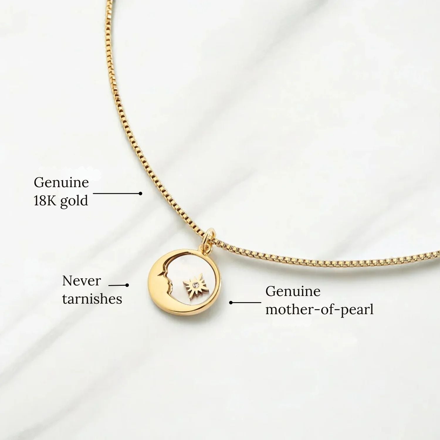 A poetic necklace that captures the moon’s soft glow and gentle beauty. Featuring a natural mother-of-pearl pendant suspended from a fine gold chain, it combines timeless elegance with delicate charm. Wear it alone for subtle radiance or layered for a modern look.