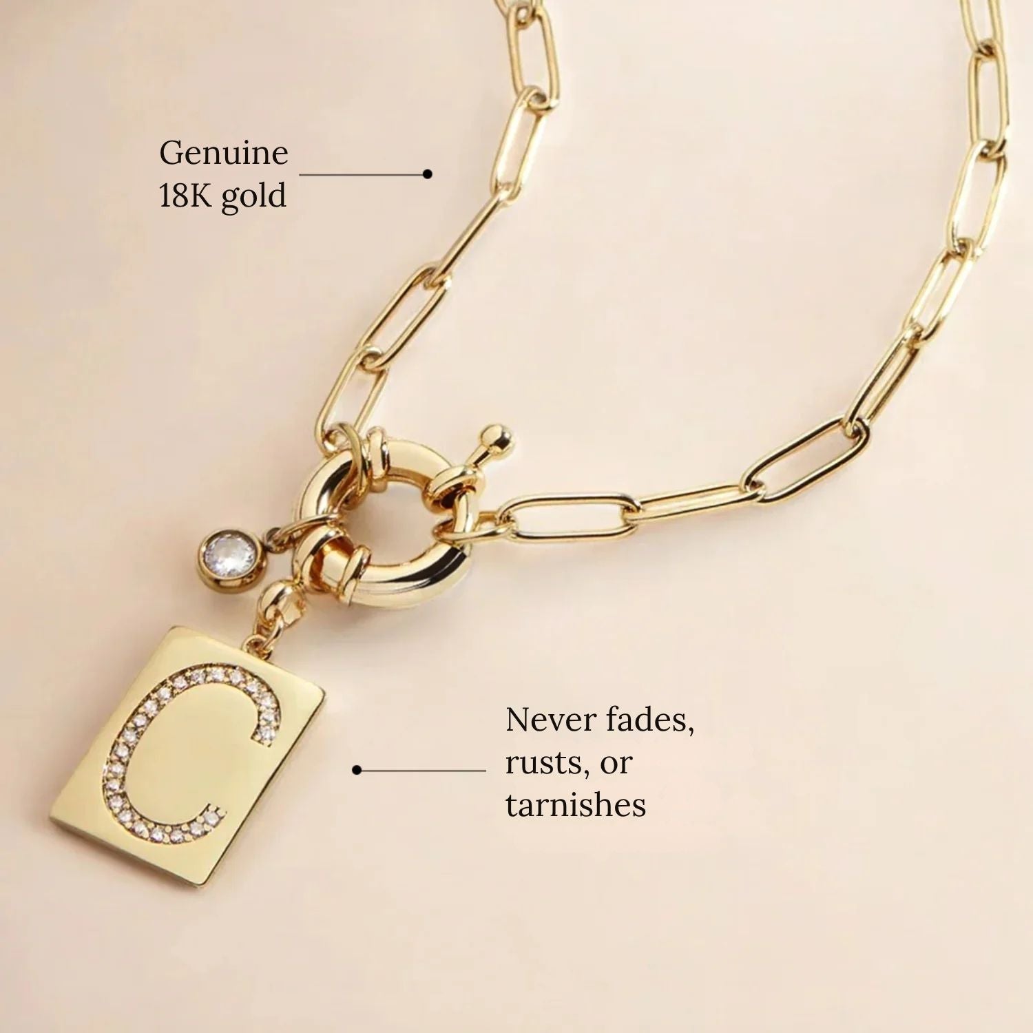 A personalized touch with a distinctly modern style. This pavé initial pendant, adorned with sparkling stones, pairs beautifully with a refined link chain for the perfect balance between elegance and trend. Wear it solo for a chic statement or layered for a bolder, fashion-forward look.