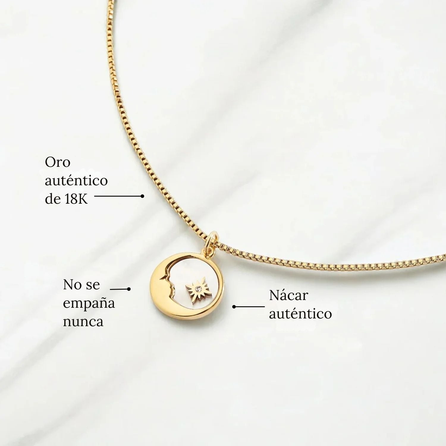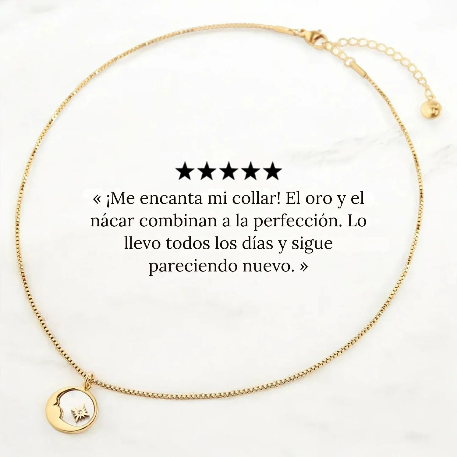 Un collar poético que captura la suavidad y la luz de la luna. Su colgante de nácar natural, suspendido de una fina cadena dorada, combina belleza atemporal y elegancia delicada. Para llevarlo solo y lograr un brillo refinado o superpuesto para un estilo tendencia.