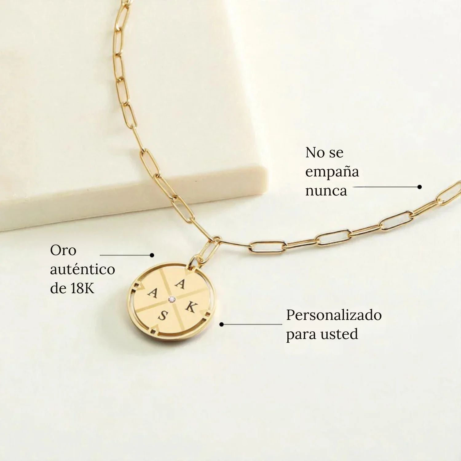 • Materiales: acero inoxidable quirúrgico 316L impermeable chapado en oro de 18K