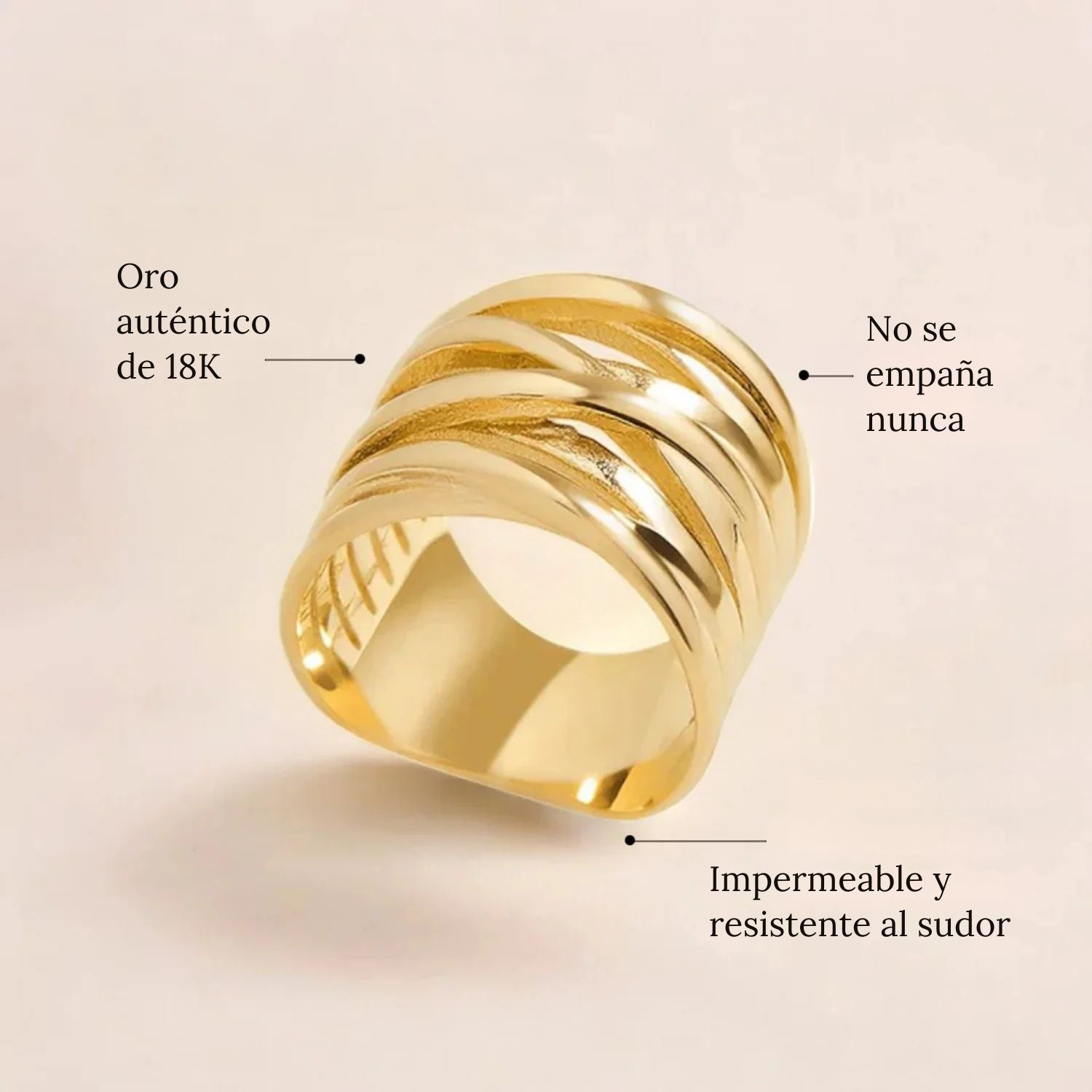 Un anillo audaz de diseño escultural y contemporáneo. Sus líneas entrelazadas crean una textura impactante y un estilo único que atrae inmediatamente la mirada. Ideal para quienes aman las joyas expresivas, realza tanto un conjunto sobrio como un look de noche sofisticado.