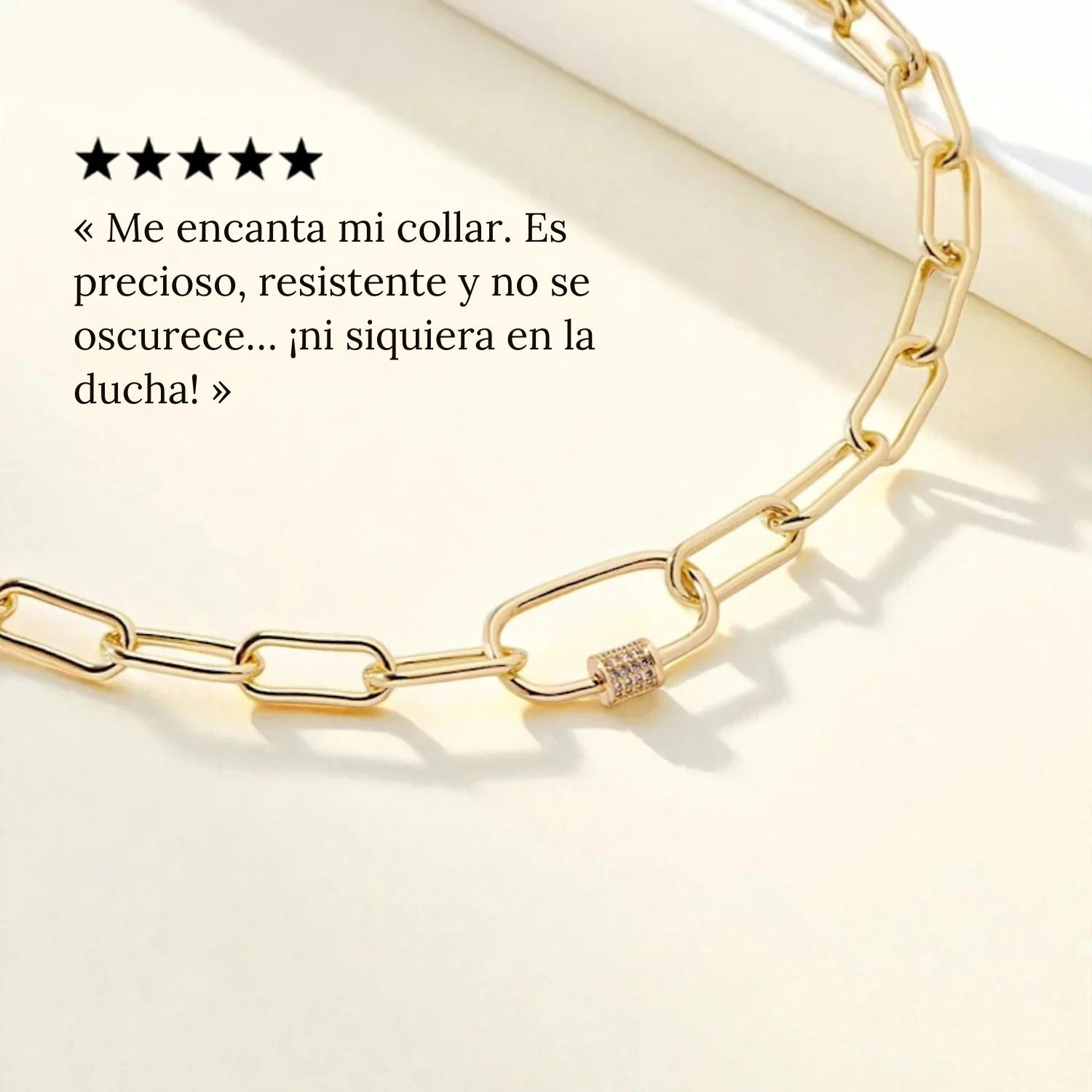 Un equilibrio perfecto entre audacia y elegancia. Este collar de cadena con eslabones se distingue por su mosquetón adornado con piedras centelleantes, combinando seguridad y estilo. Con su cadena dorada de carácter marcado, encarna un lujo cotidiano que atrae la luz y las miradas.