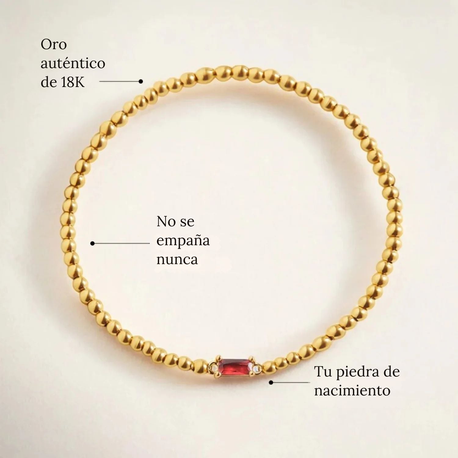 Una pulsera refinada y simbólica, compuesta por perlas doradas realzadas por una piedra de nacimiento centelleante. Una joya elegante para regalar o llevar para celebrar su mes de nacimiento, sola o combinada.