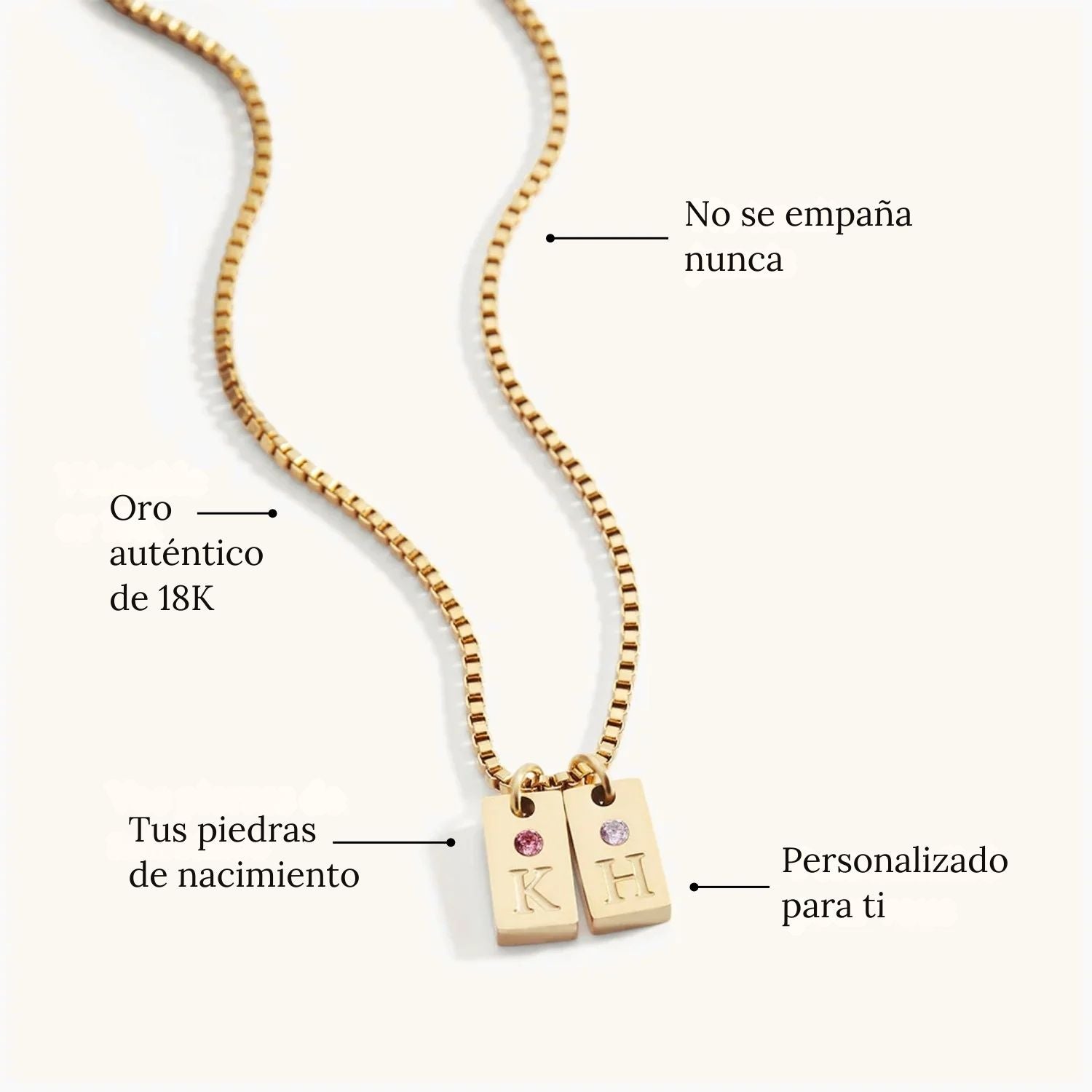 • Personalización: hasta 4 colgantes con iniciales y piedras de nacimiento