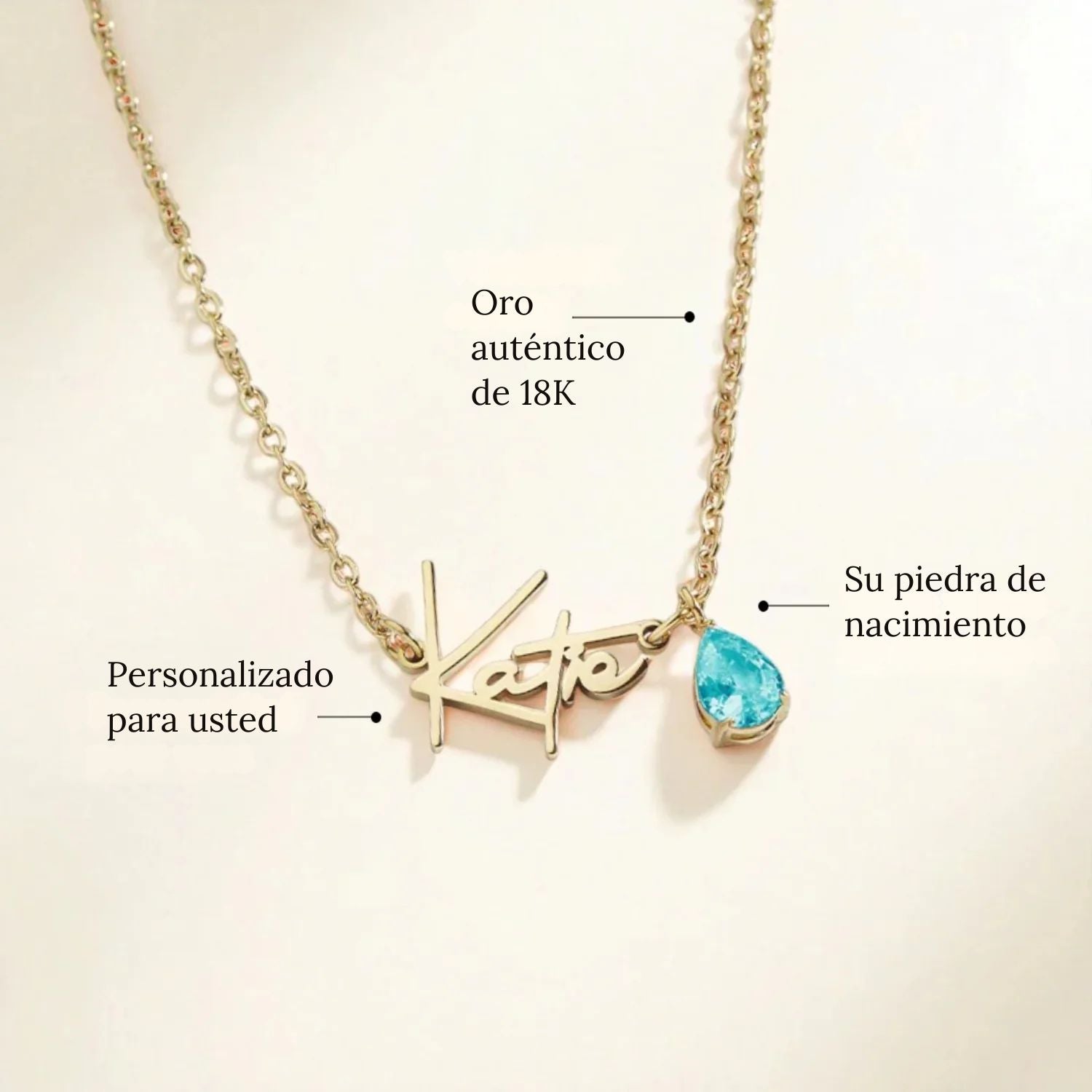 Un collar personalizado que celebra lo que más importa. Cada pieza hecha a mano combina la elegancia de un nombre grabado con el brillo de una piedra de nacimiento centelleante. Chic y refinado, se lleva a diario o se ofrece como un regalo lleno de significado.