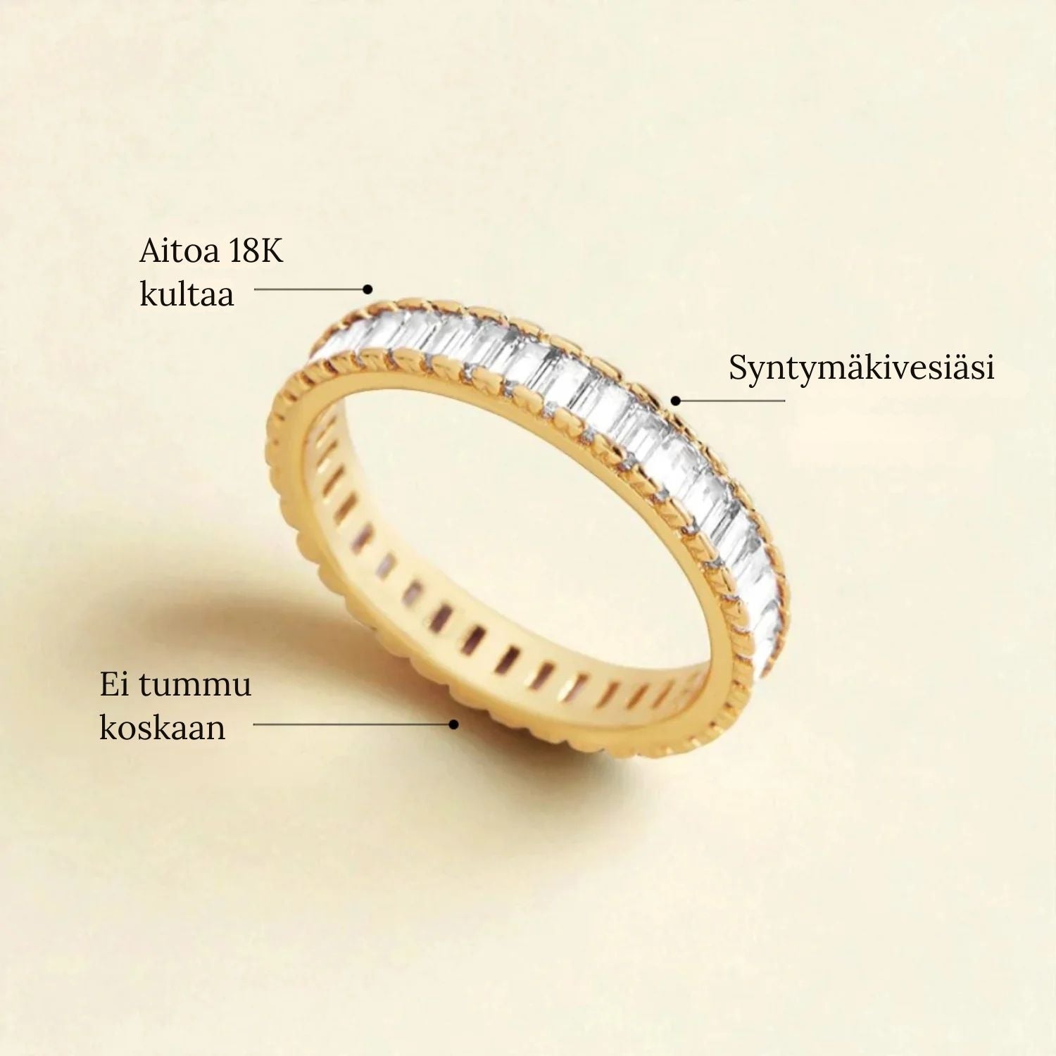 Hienostunut ikuinen sormus, joka juhlistaa tarinaasi tyylikkäällä herkkyydellä. Jatkuvana rivinä asetellut säihkyvät baguette-hiotut kivet symboloivat jatkuvuutta ja ajatonta kauneutta. Käytä yksinään hienovaraisen hehkun luomiseksi tai yhdistä useisiin sormuksiin rohkeamman ilmeen saavuttamiseksi.