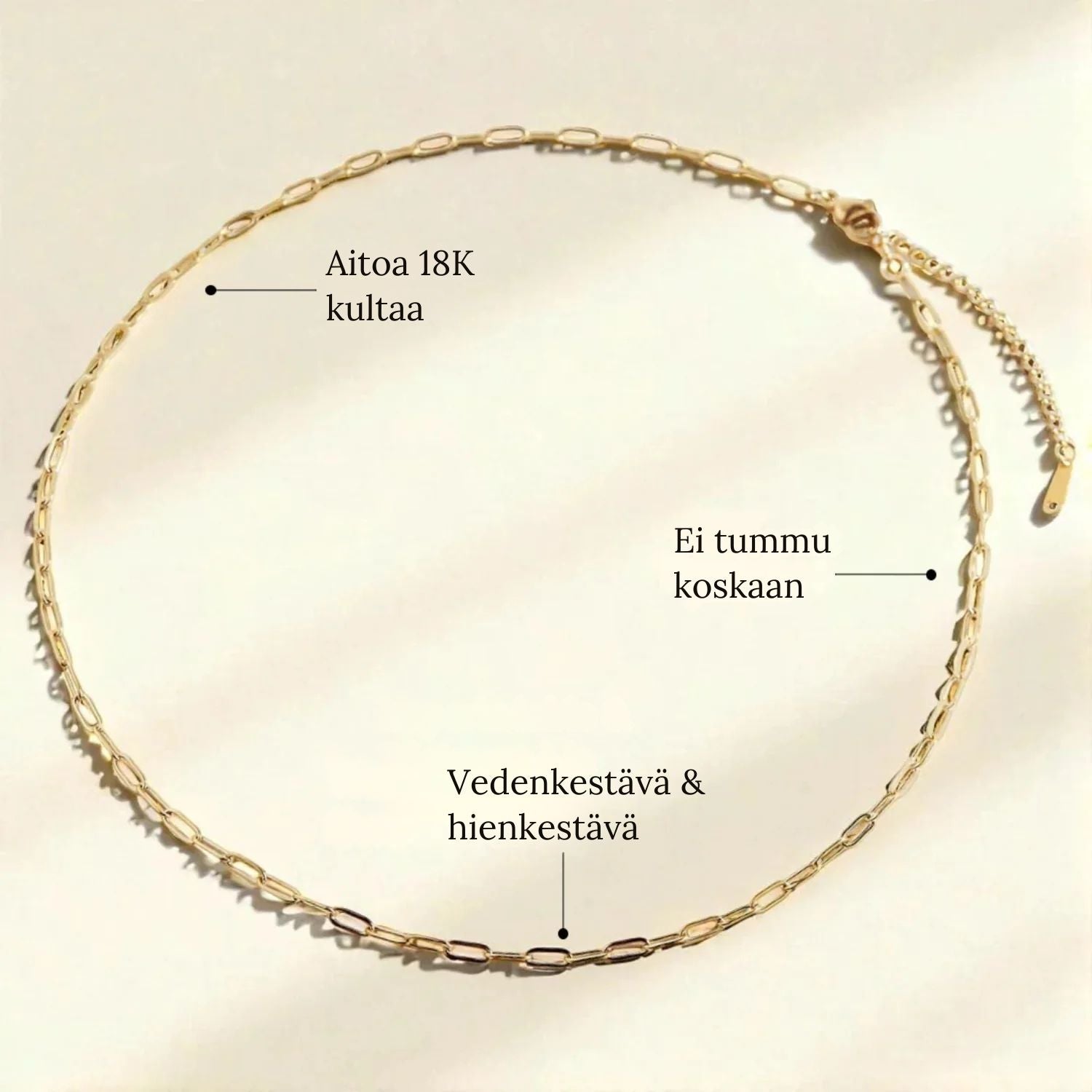 Hienostunut ja ajaton kaulakoru, täydellinen jokapäiväiseen käyttöön. Sen ohuet suorakulmaiset lenkit luovat puhtaan ja elegantin ilmeen — kaunis yksinään pelkistettyyn tyyliin tai kerrostettuna modernin ja viimeistellyn vaikutelman saavuttamiseksi.