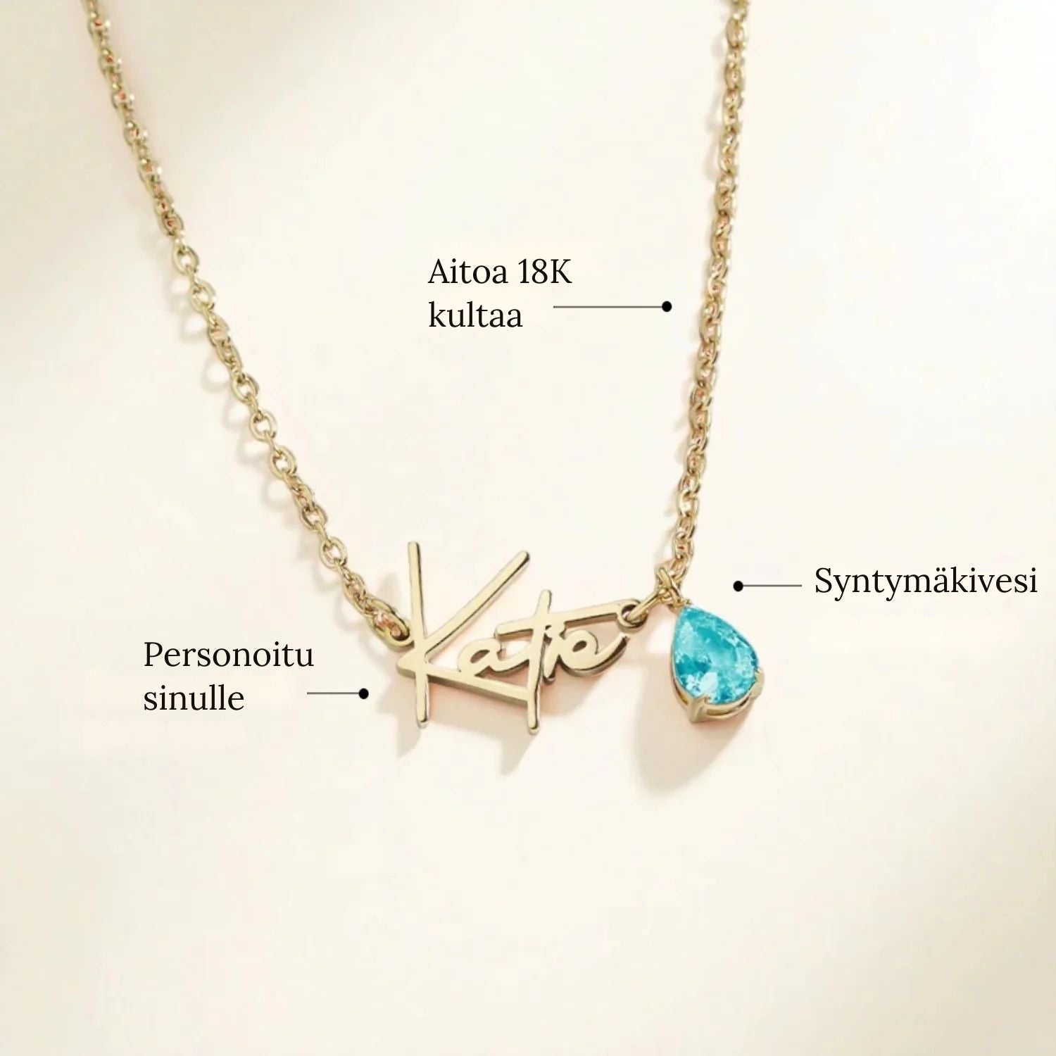 Personoitu kaulakoru, joka juhlistaa sitä, mikä merkitsee eniten. Jokainen käsintehty koru yhdistää kaiverretun nimen elegantin ilmeen säihkyvään syntymäkiveen. Tyylikäs ja hienostunut, se sopii täydellisesti arkeen tai merkitykselliseksi lahjaksi annettavaksi.