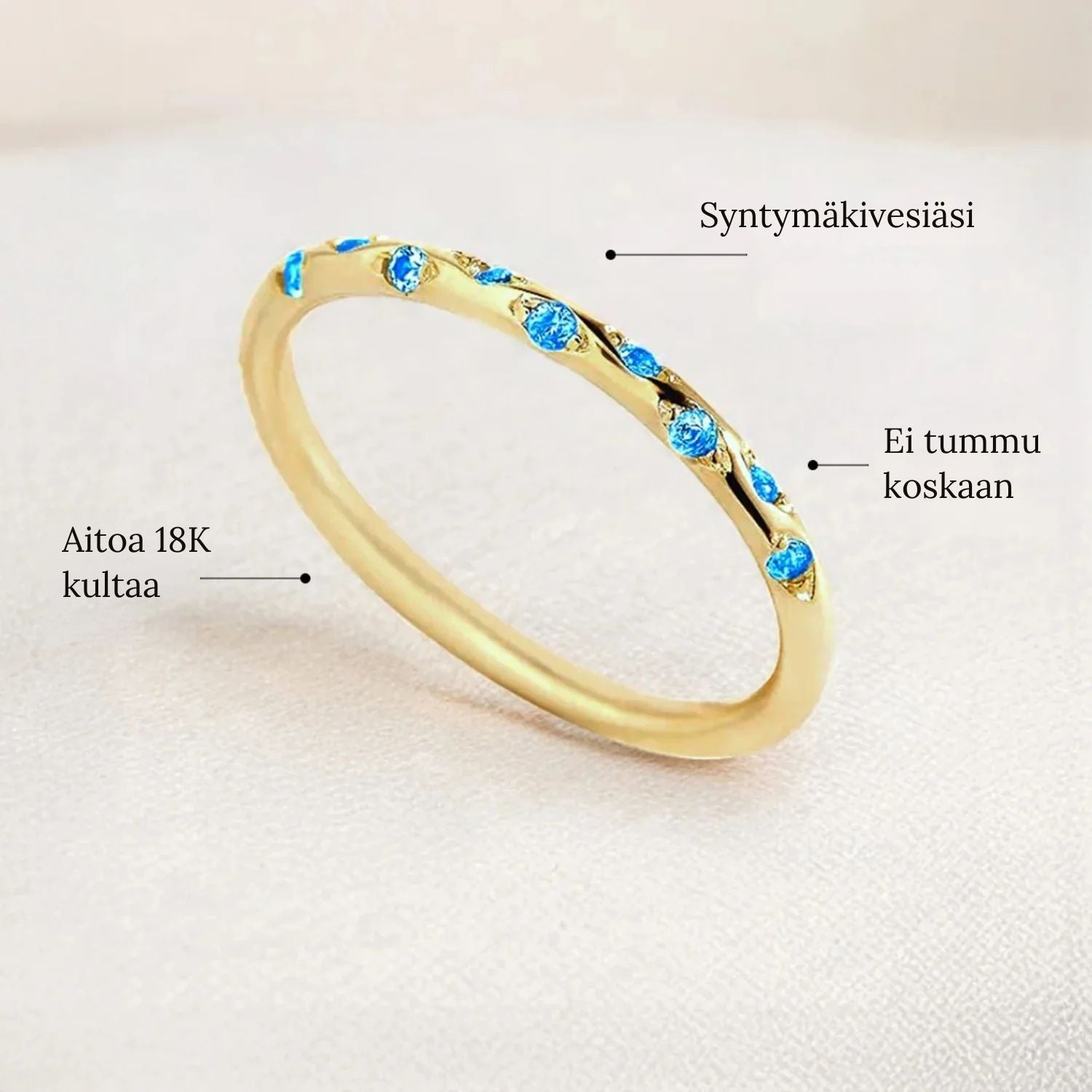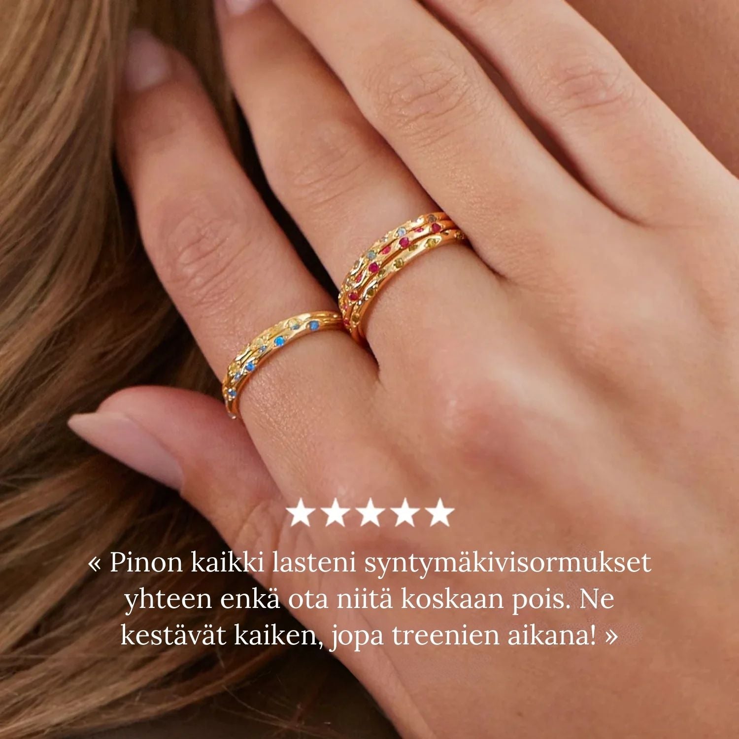 Hienovarainen yhdistelmä henkilökohtaista tyyliä ja taivaallista viehätystä. Tämä syntymäkivillä koristeltu sormus tuo esiin pehmeän ja elegantin säihkeen, kun taas tähtikuvioinen muotoilu kutsuu kosmoksen kauneuden sormiesi ulottuville.
