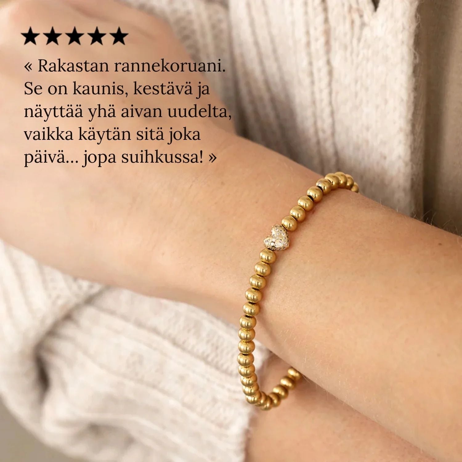 Hienostunut rannekoru, jossa eleganssi kohtaa pehmeyden. Herkät kullatut helmet ja säihkyvällä pavé-sydämellä koristeltu yksityiskohta tuovat ranteeseen valoa ja romanttista viehätystä. Täydellinen käytettäväksi yksinään tai kerrostettuna tyylikkään ja modernin ilmeen luomiseksi.