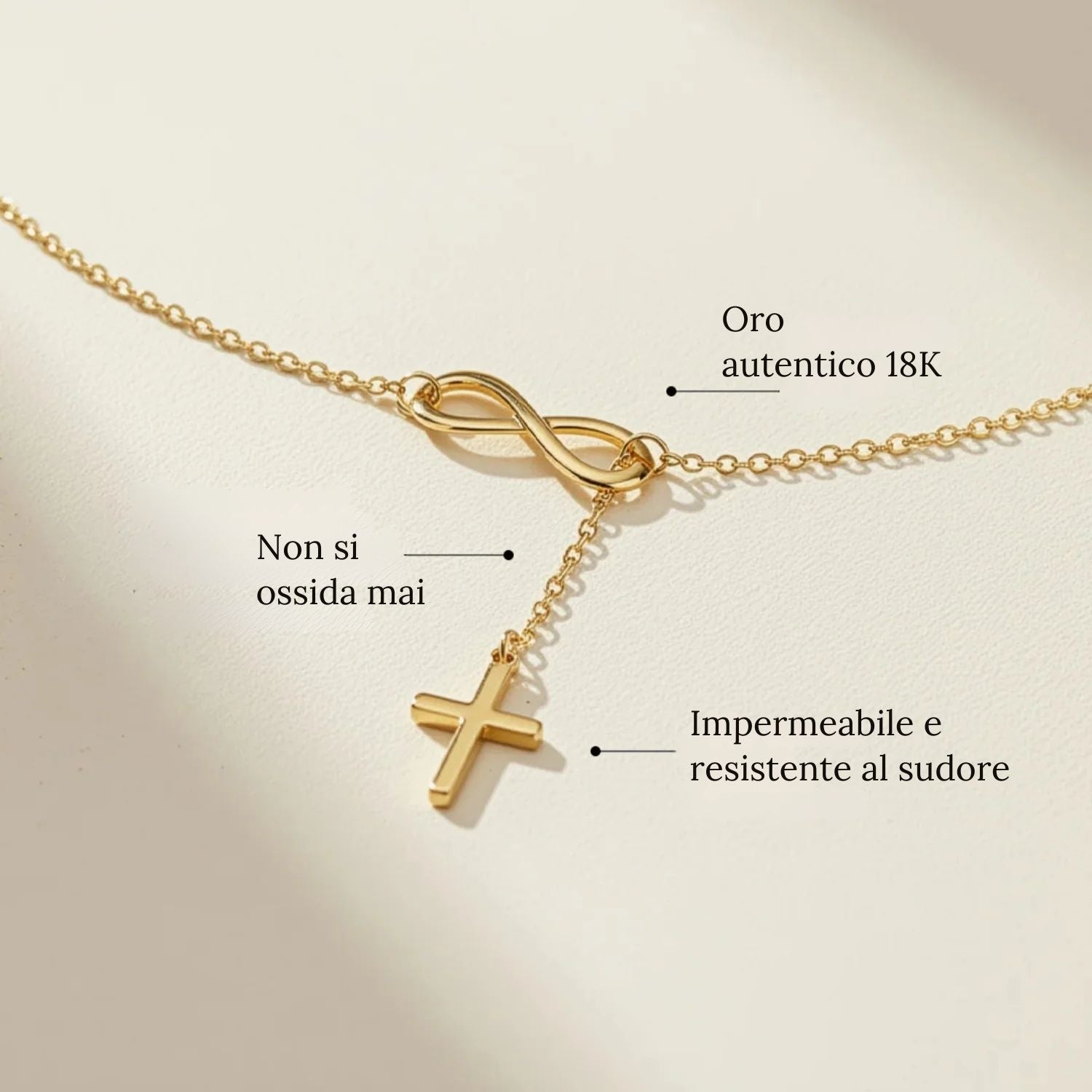 Una fusione delicata tra amore infinito e fede incrollabile. Questa collana con croce e simbolo dell’infinito si indossa da sola o in sovrapposizione con eleganza, per un simbolo forte e raffinato da tenere ogni giorno vicino al cuore.