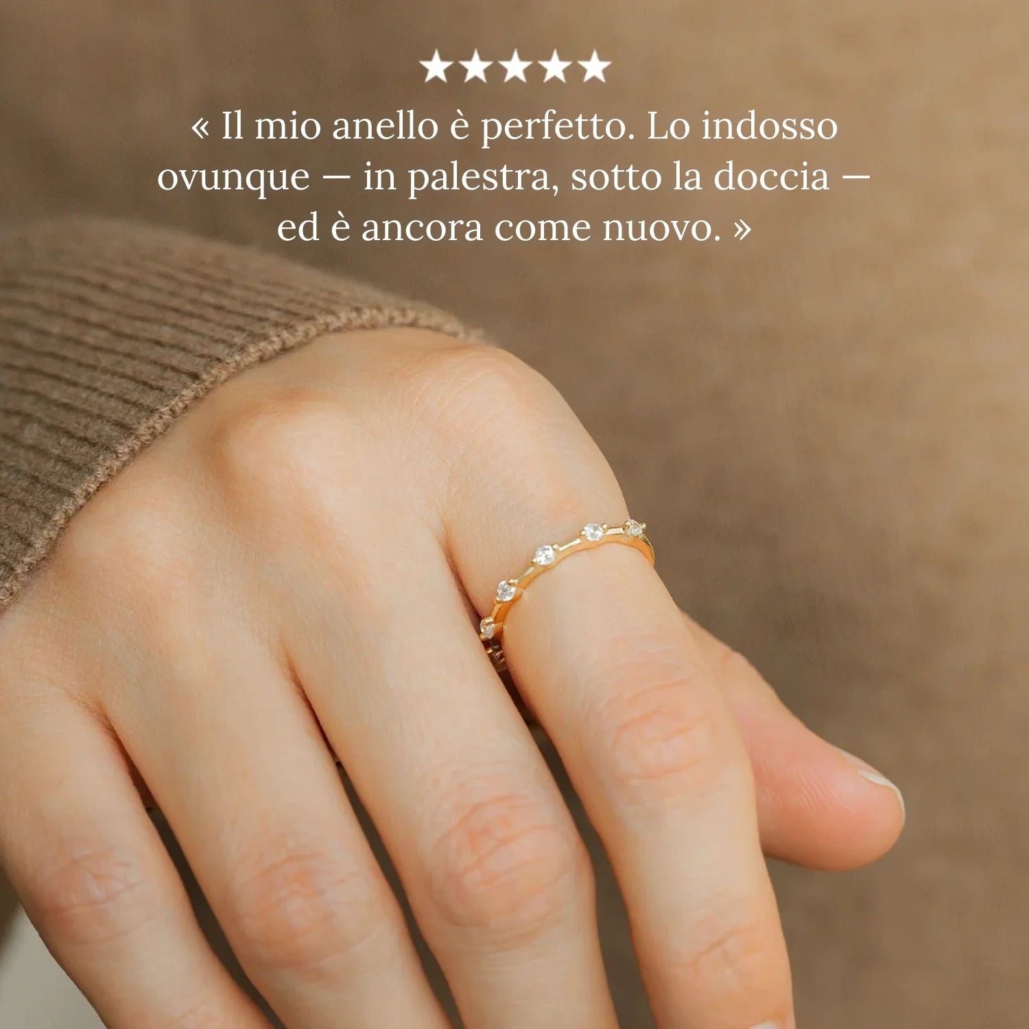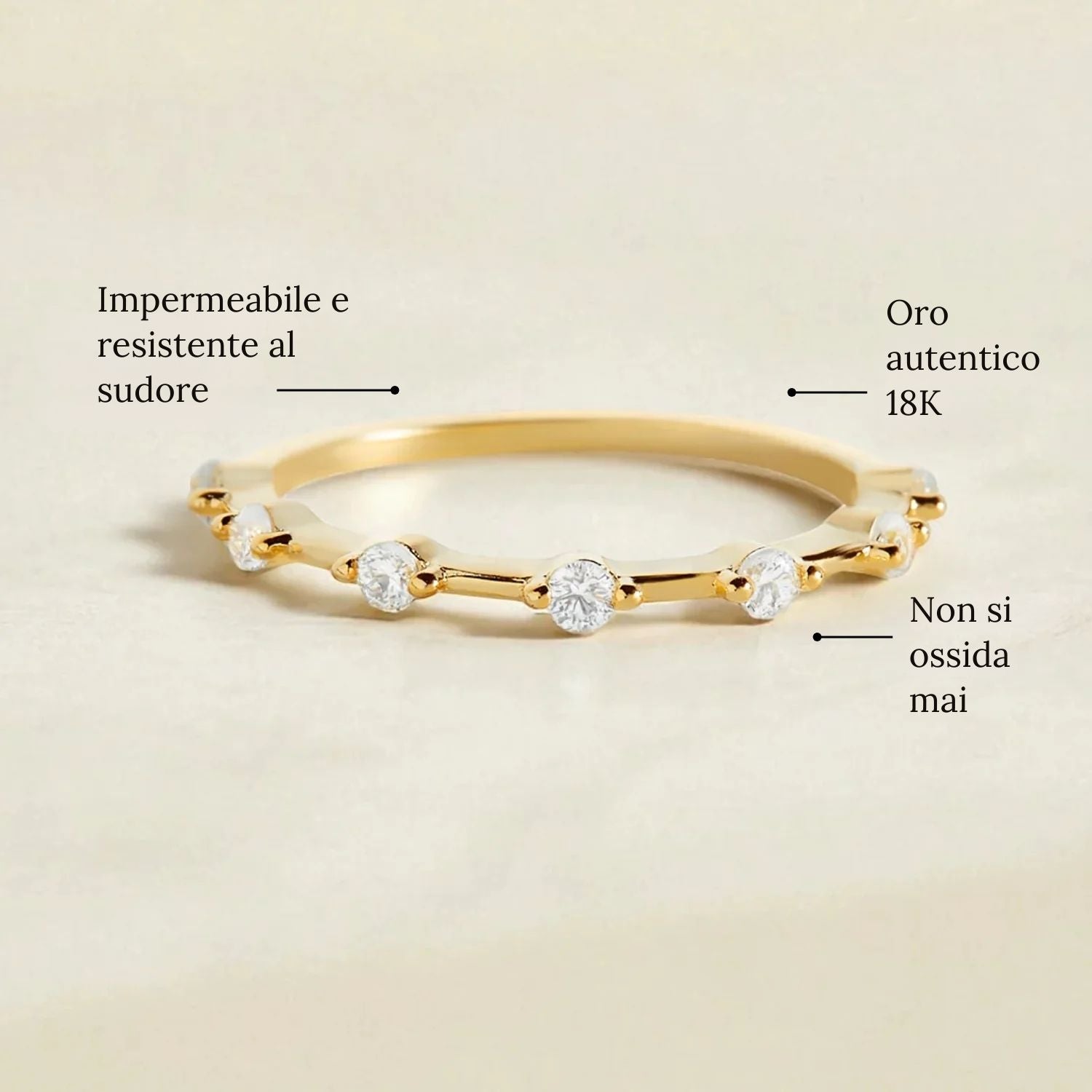 Un anello sottile e luminoso che incarna l’eleganza minimalista. Il design delicato e le pietre scintillanti donano una brillantezza discreta, perfetta da indossare da sola per un tocco raffinato oppure in abbinamento per uno stile senza tempo.