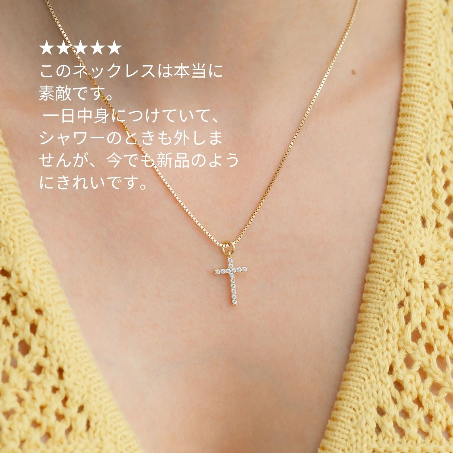 きらめくパヴェストーンをあしらったクロスペンダントが光を美しく捉え、