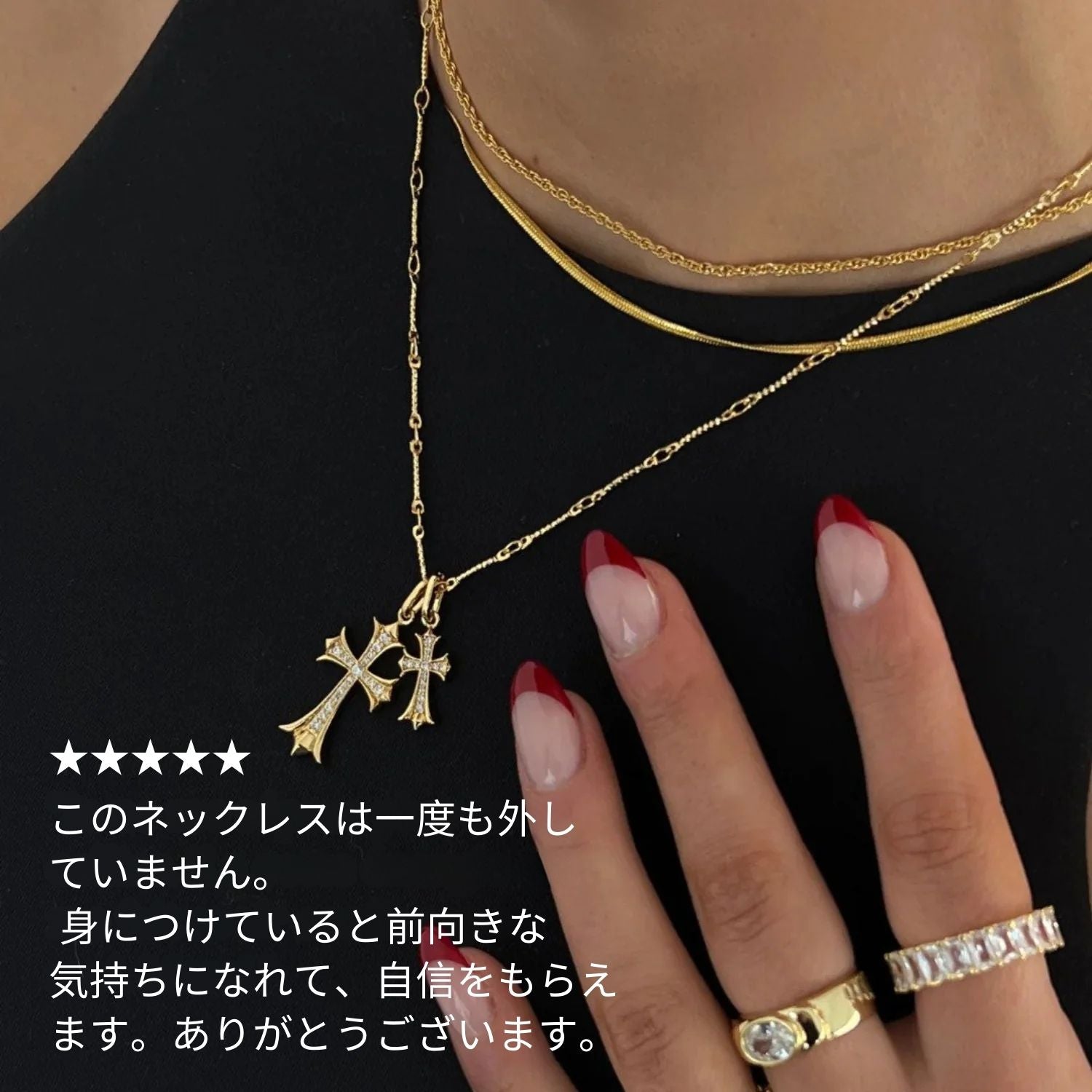 ダブルクロスのペンダントが、エレガンスと大胆さを同時に表現し、