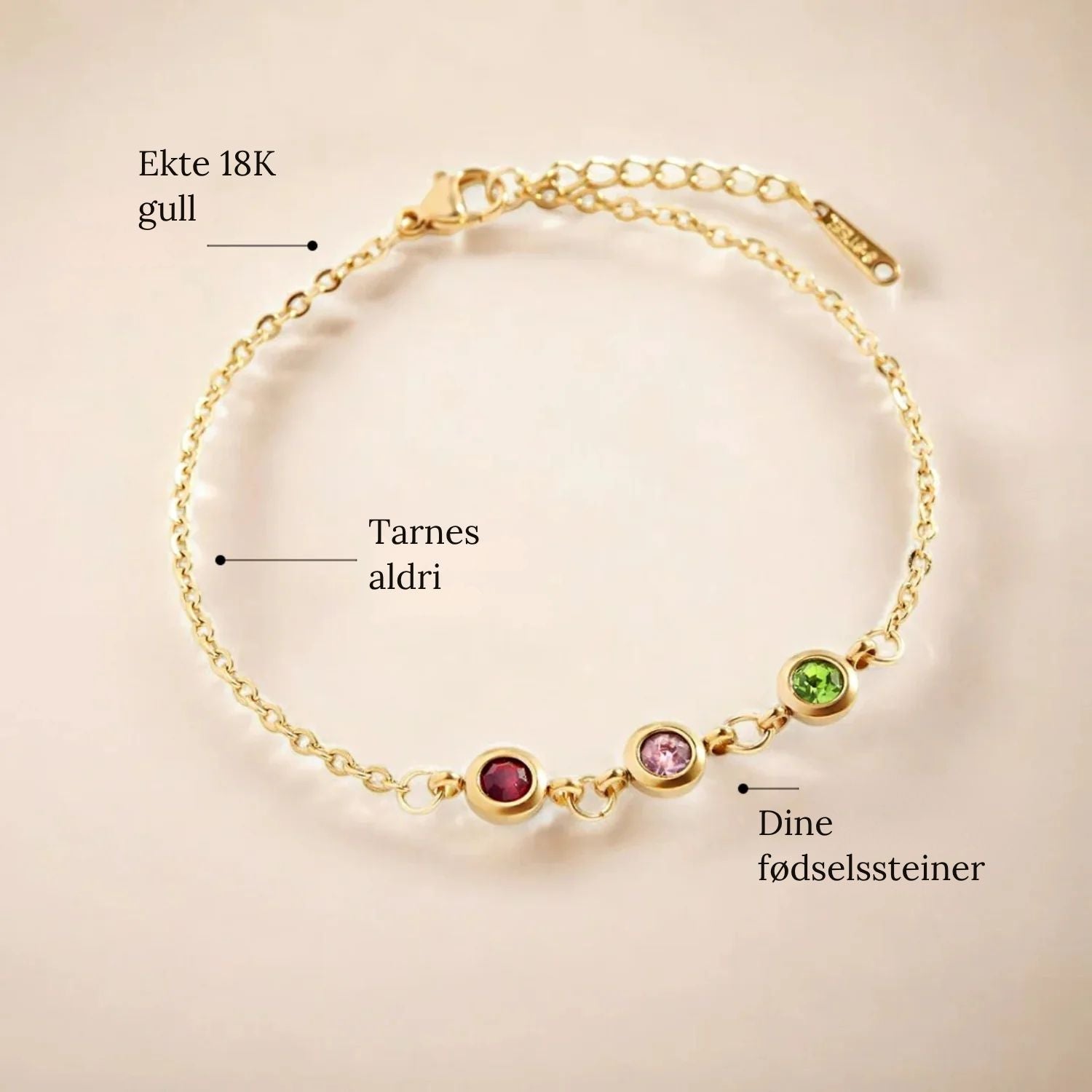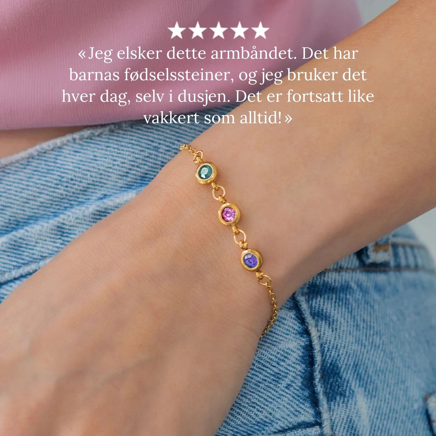 Et elegant og meningsfylt smykke. Harmoni Fødselsstein Armbåndet kan personliggjøres med dine favorittsteiner for å symbolisere dine nærmeste eller din egen historie. Et raffinert design å bære hver dag eller ved spesielle anledninger – perfekt som bursdagsgave, jubileumsgave eller bare for å unne seg noe vakkert.