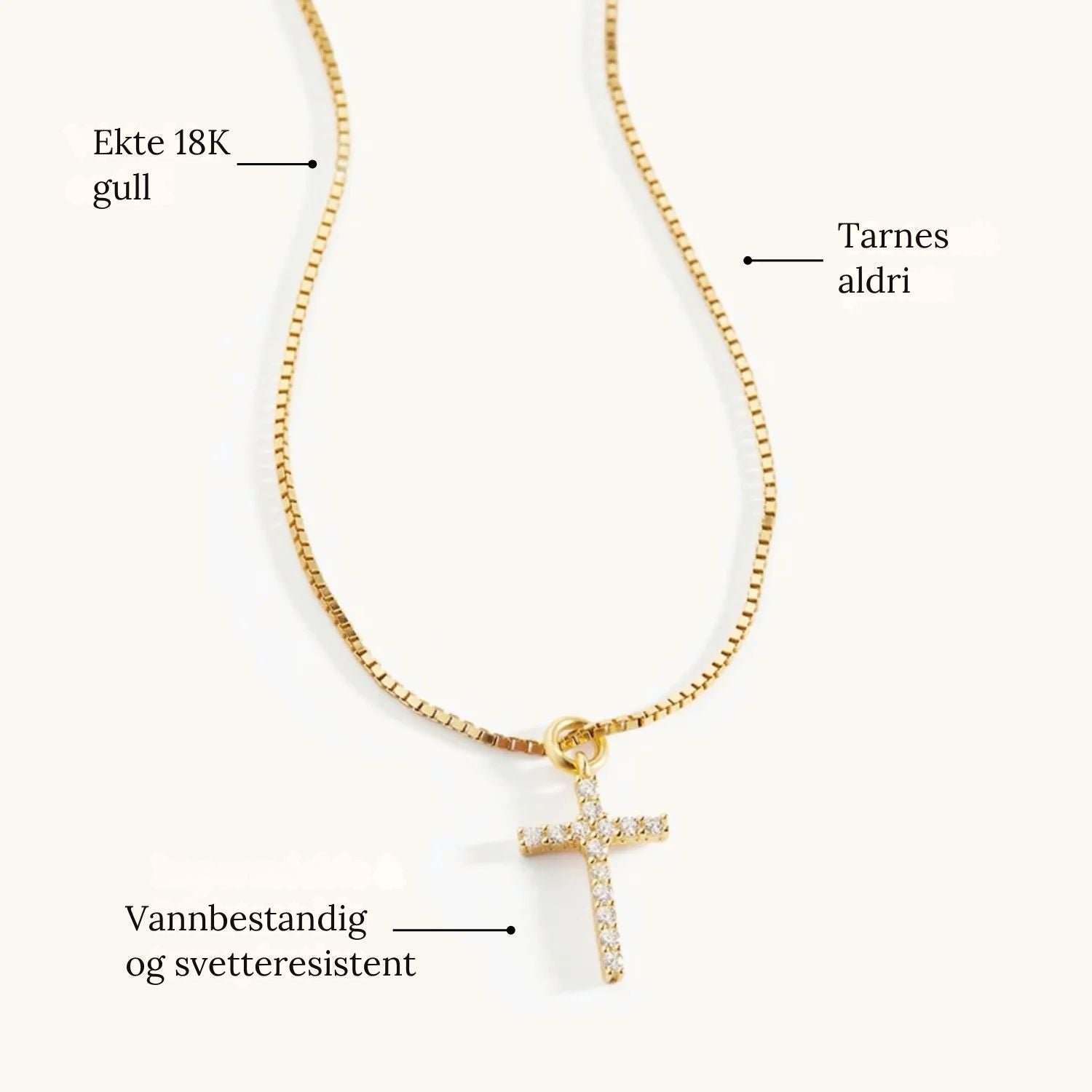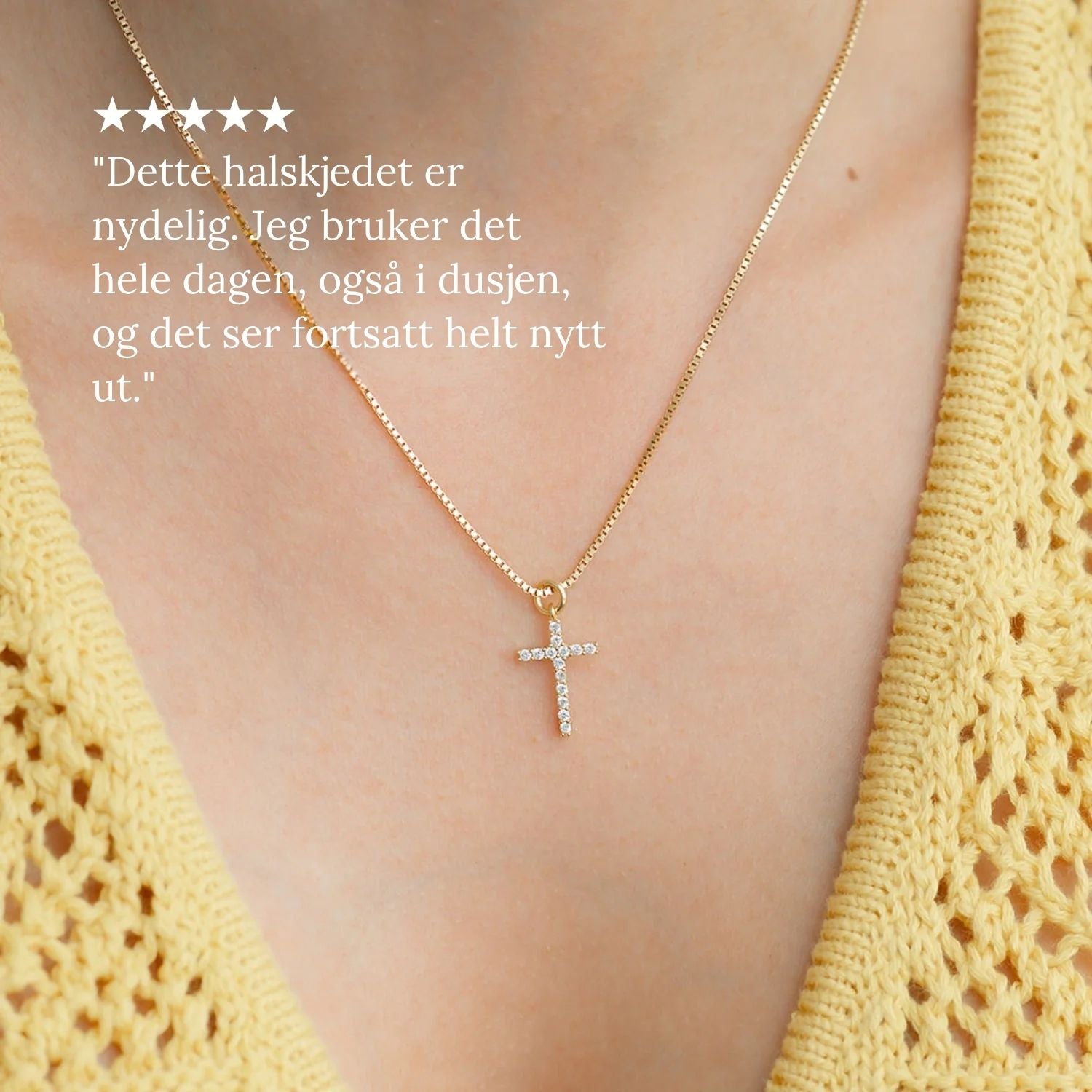 Et halskjede som kombinerer eleganse og spiritualitet. Det pavébesatte korsanheng­et fanger lyset på vakkert vis og tilfører et snev av glamour til dette tidløse symbolet på tro og beskyttelse.
