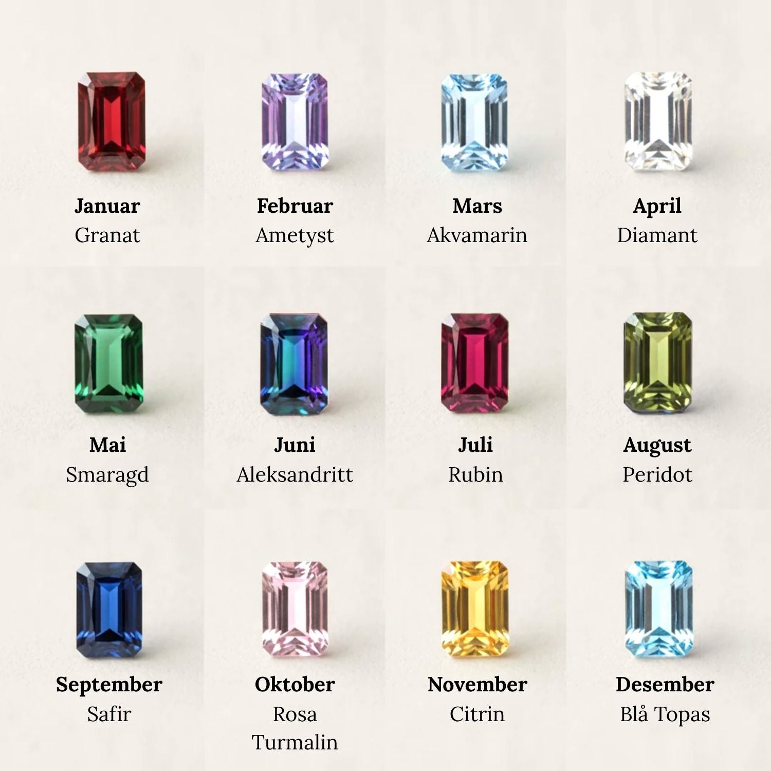 Fargede zirkonsteiner som representerer hver fødselsmåned