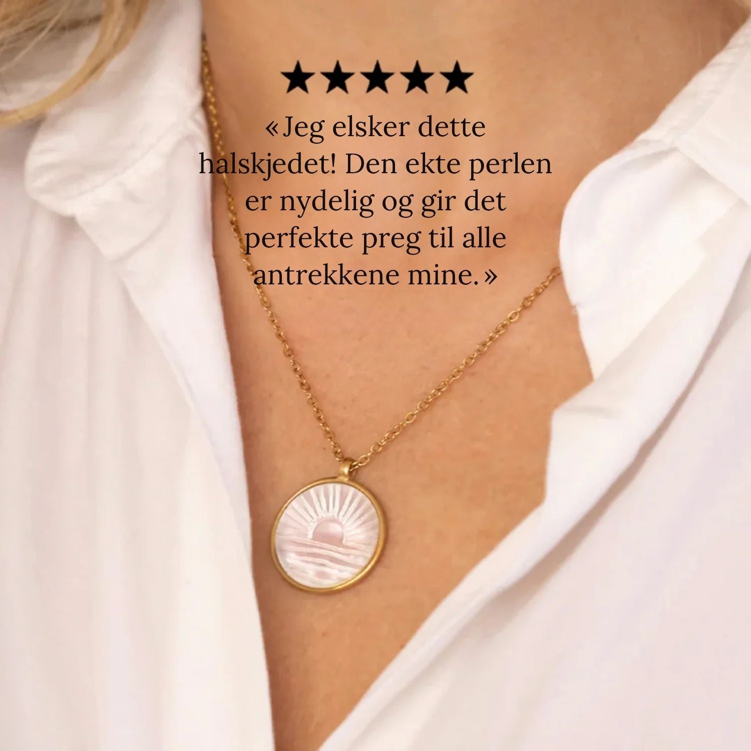 Et lyst og inspirerende anheng som fremkaller skjønnheten i en soloppgang. Den iriserende perlemoren fanger lyset og symboliserer nye begynnelser – et smykke som kombinerer eleganse og inspirasjon i én delikat skapning.