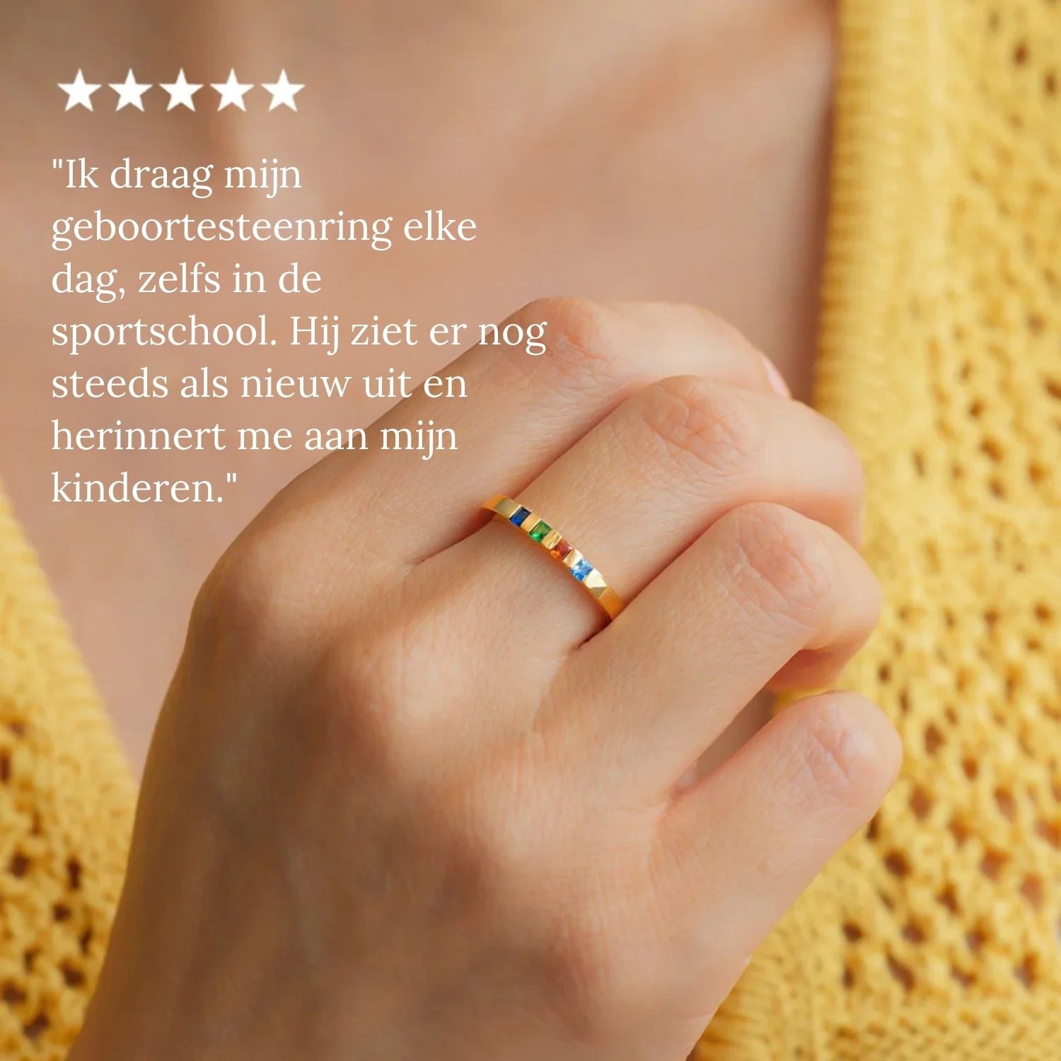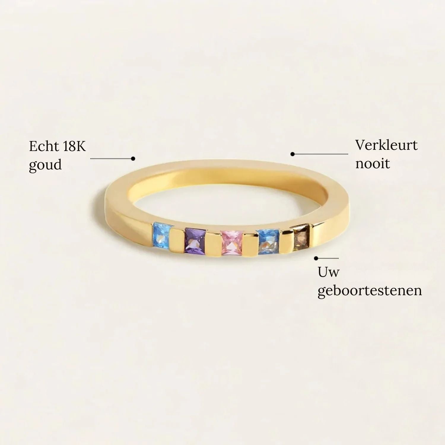 Een elegante en persoonlijke ring. De ring met princess-cut stenen biedt een verfijnde en symbolische kleuraccent. Perfect om een speciaal moment te vieren of uw looks te verfraaien met tijdloze charme.
