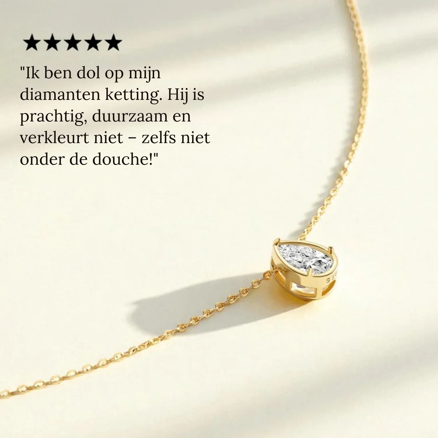 Een delicate en tijdloze ketting, voorzien van een druppelvormige moissaniet‑hanger die bij elke beweging het licht vangt. Verfijnd en elegant, solo te dragen voor subtiele glans of in lagen voor een gedurfde look. Een sieraad van stille schoonheid dat nooit onopgemerkt blijft.