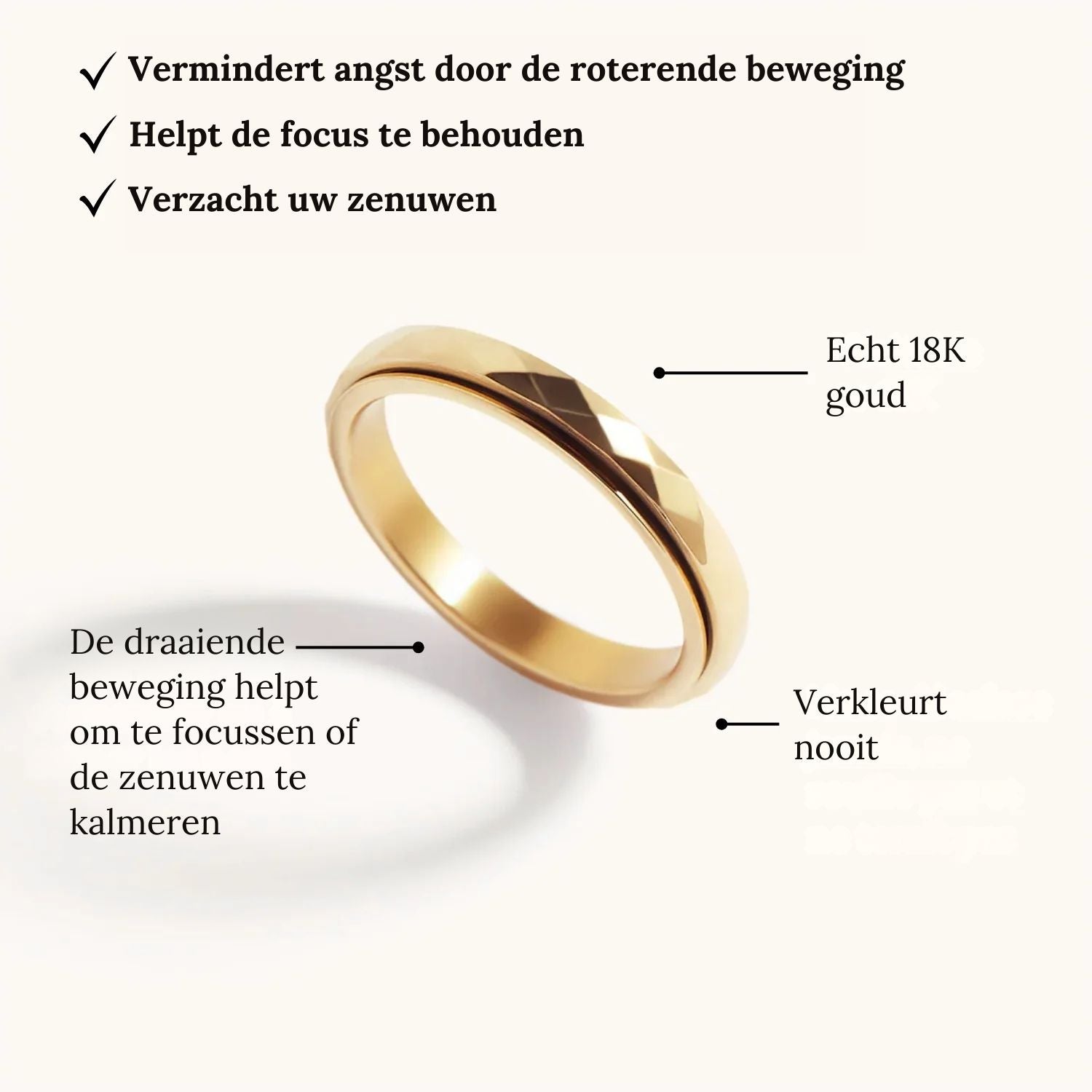 Een fijne en elegante ring, ontworpen om de geest te kalmeren en de concentratie te bevorderen. Het geslagen ontwerp bevat een beweegbare ring die zachte sensorische stimulatie biedt, helpt energie te kanaliseren en stress te verminderen. Onderzoek toont aan dat dit soort herhaalde bewegingen kan bijdragen aan verbeterde concentratie en natuurlijke ontspanning, vooral bij mensen met angst of aandachtstekortstoornis (ADHD).