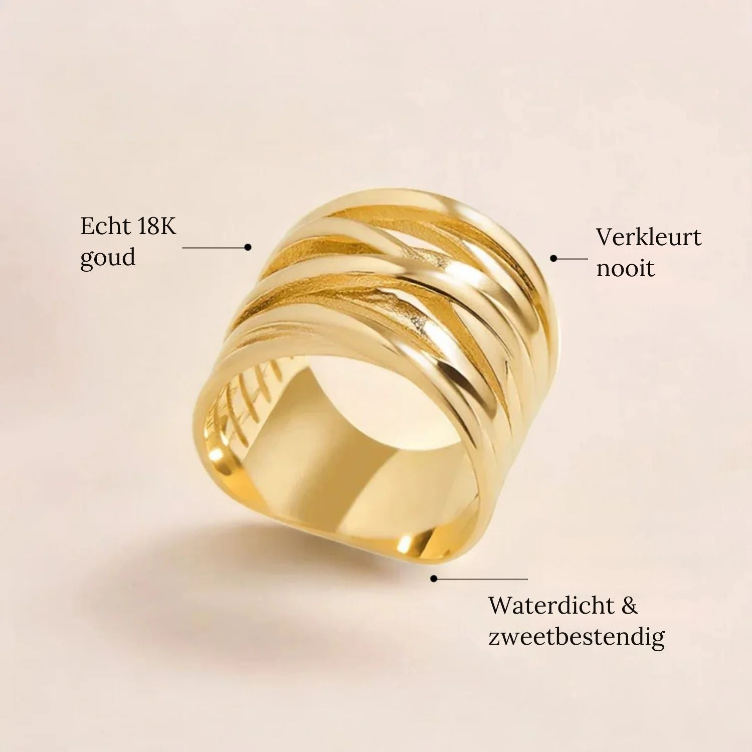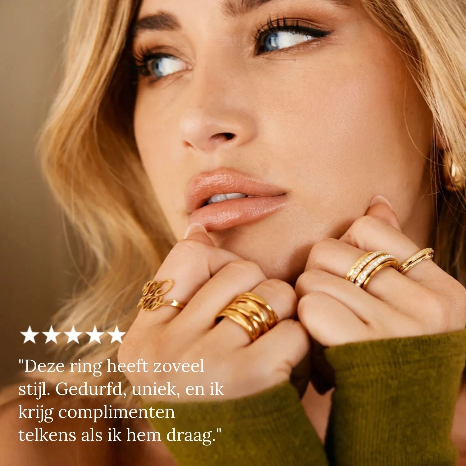 Een gedurfde ring met een sculpturaal en eigentijds design. De verstrengelde lijnen creëren een opvallende textuur en een unieke stijl die meteen de aandacht trekt. Ideaal voor wie van expressieve sieraden houdt: deze ring maakt zowel een minimalistische outfit als een verfijnde avondlook helemaal af.
