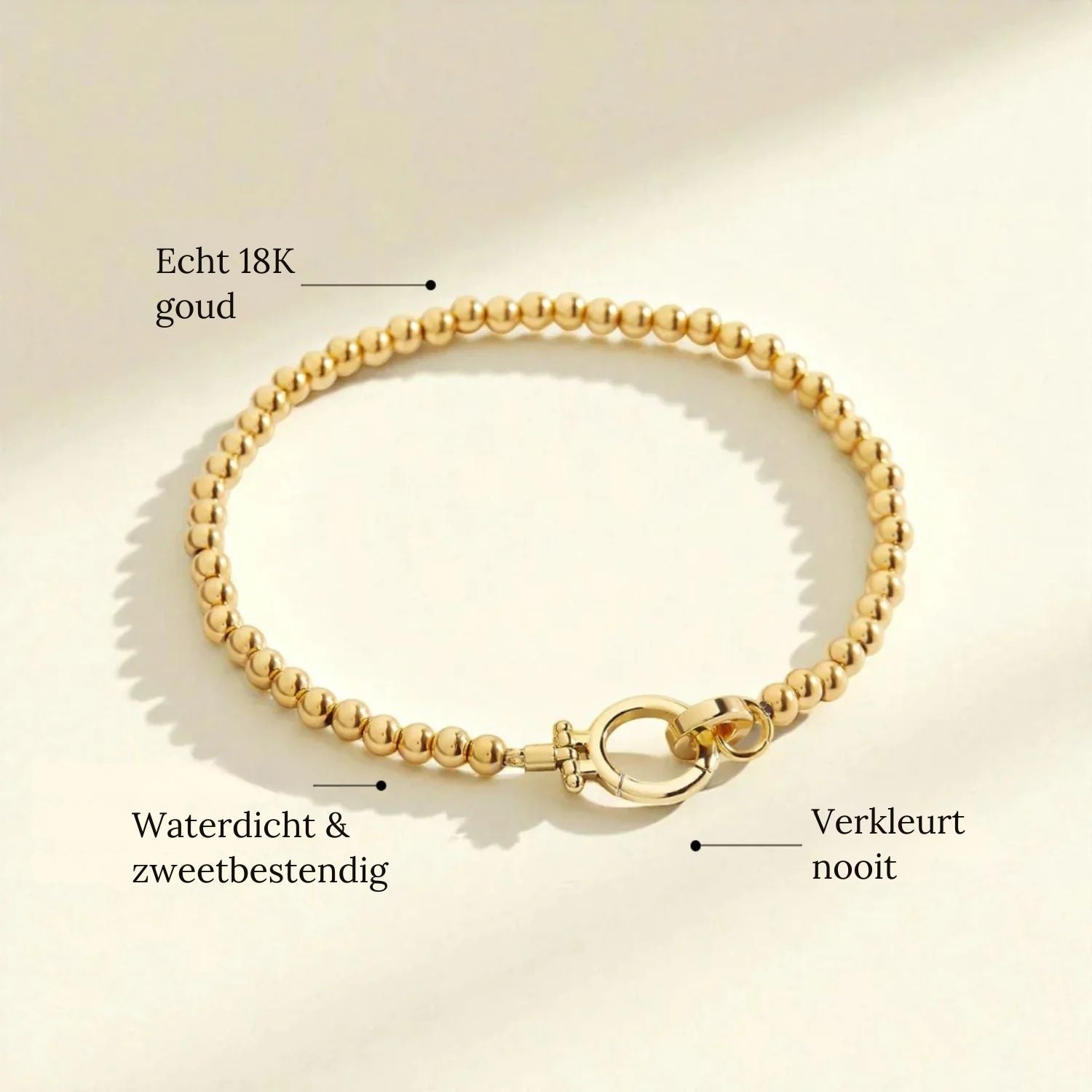 Een delicate en tijdloze armband, bestaande uit gouden parels, verfraaid met een charmante en verfijnde sluiting. Solo te dragen, gepersonaliseerd met uw favoriete charms of in lagen voor een unieke en elegante stijl.