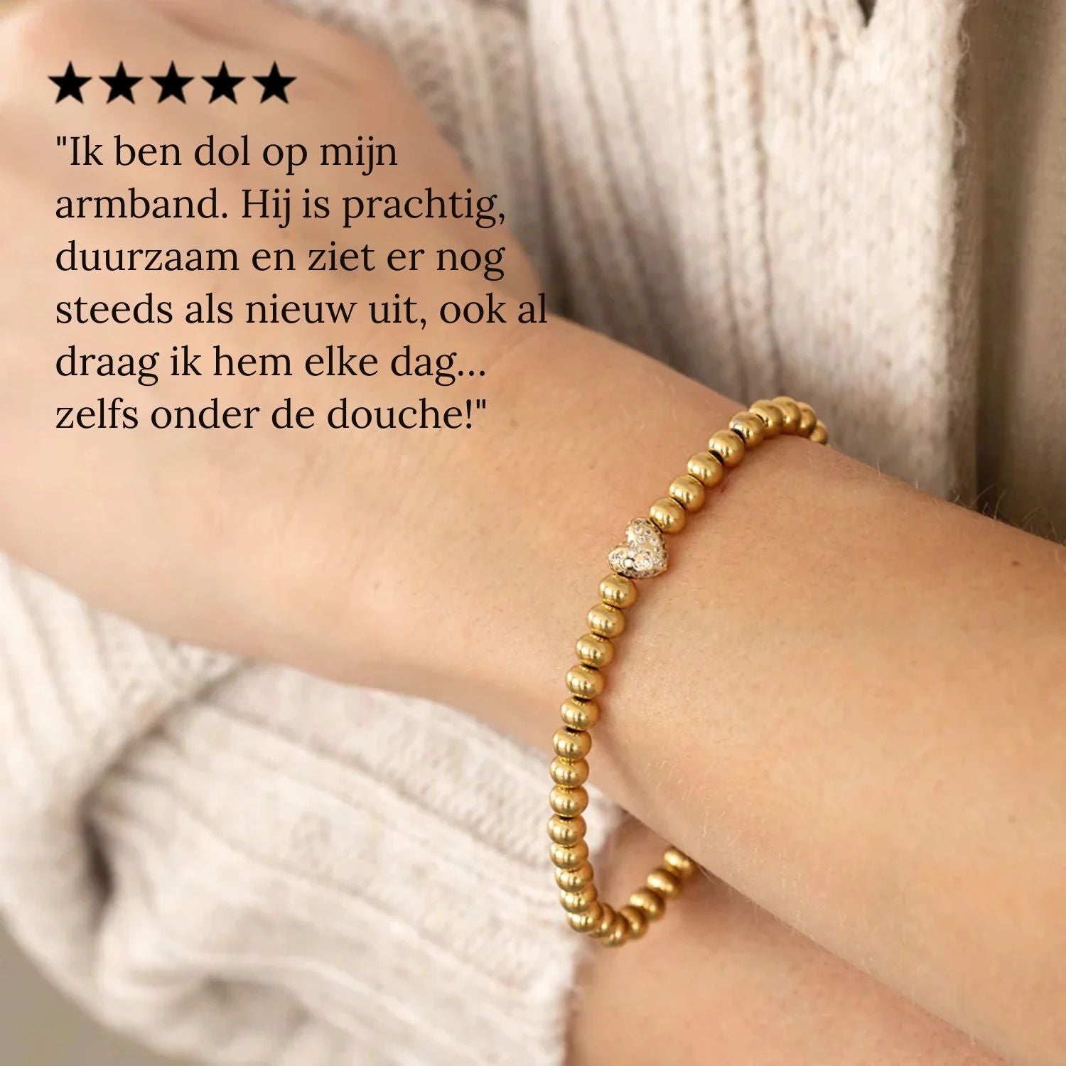 Onze sieraden zijn gemaakt om de hele dag gedragen te worden. Elk stuk is ontworpen en vervaardigd om lang mee te gaan. U hoeft ze dus nooit af te doen — of u nu aan het werk bent, met vrienden op pad bent of zelfs onder de douche staat.