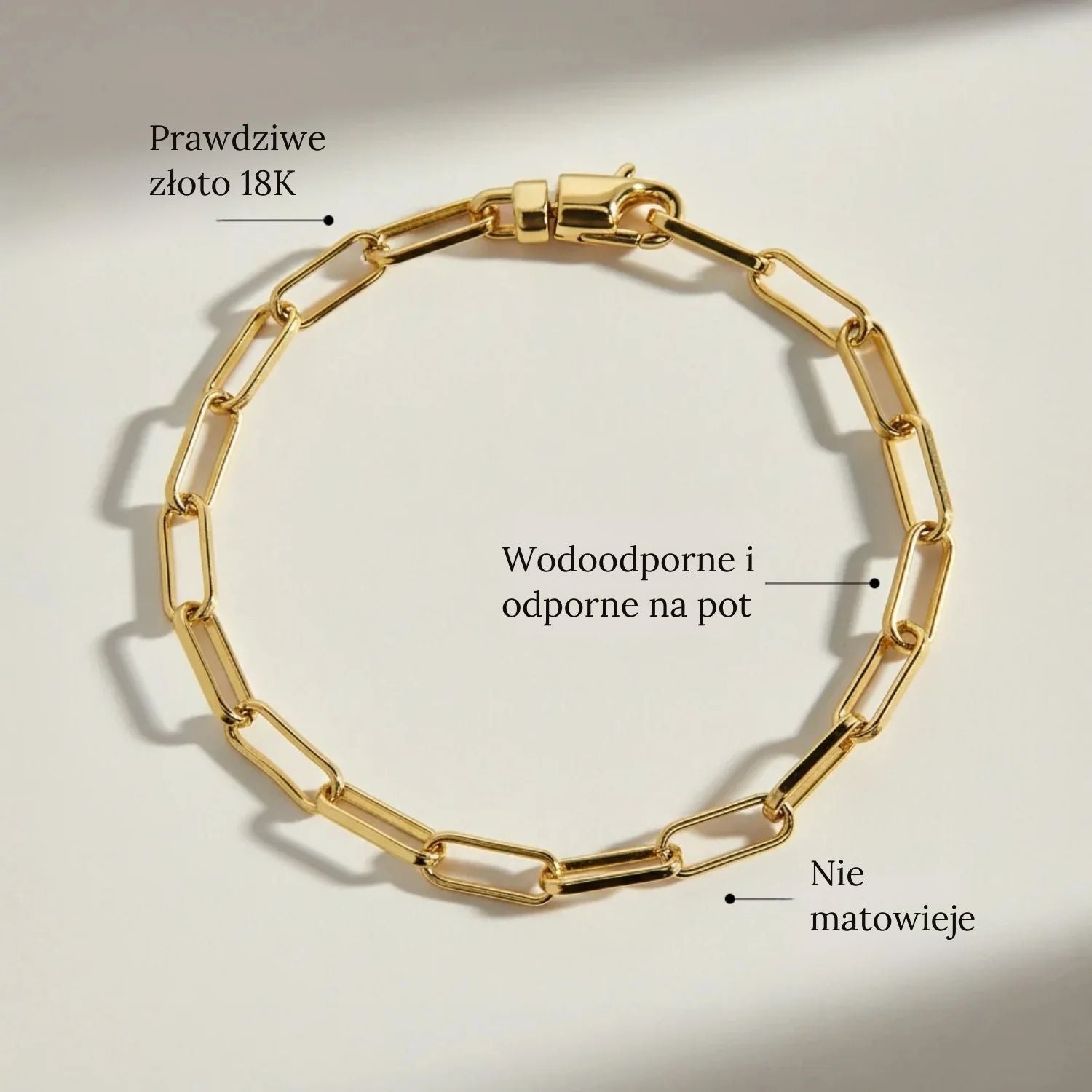 Odważna i wyrafinowana biżuteria. Bransoletka z łańcuchem o otwartych ogniwach ucieleśnia nowoczesny, minimalistyczny styl — idealna do noszenia solo dla szykownego akcentu lub warstwowo, by stworzyć wyrazisty look, zarówno w dzień, jak i w nocy.