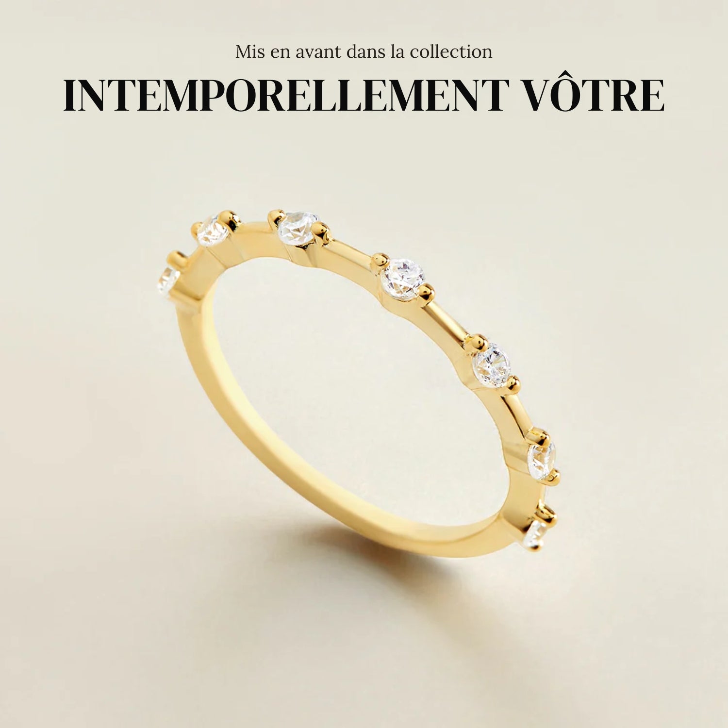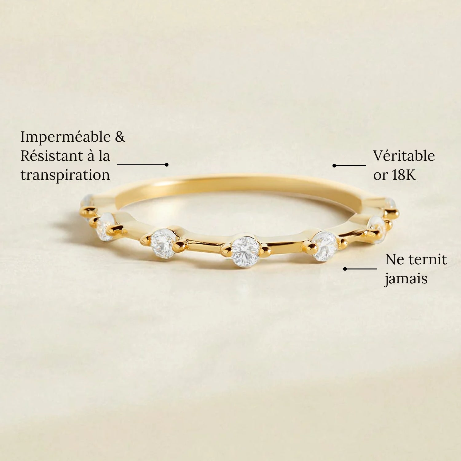 Une bague fine et lumineuse qui incarne l’élégance minimaliste. Son design délicat et ses pierres scintillantes offrent un éclat subtil, parfait à porter seule pour une touche raffinée ou en accumulation pour un style intemporel.