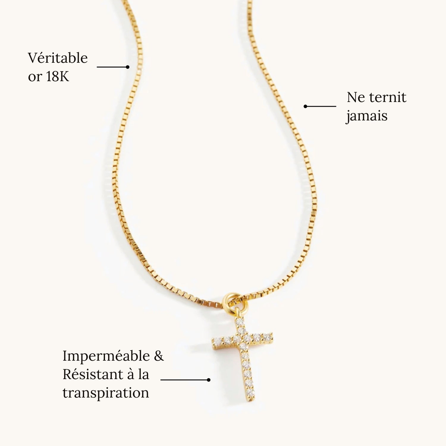 Un collier alliant élégance et spiritualité. Son pendentif croix, orné de pierres pavées étincelantes, capte magnifiquement la lumière et apporte une touche de glamour à ce symbole intemporel de foi et de protection.