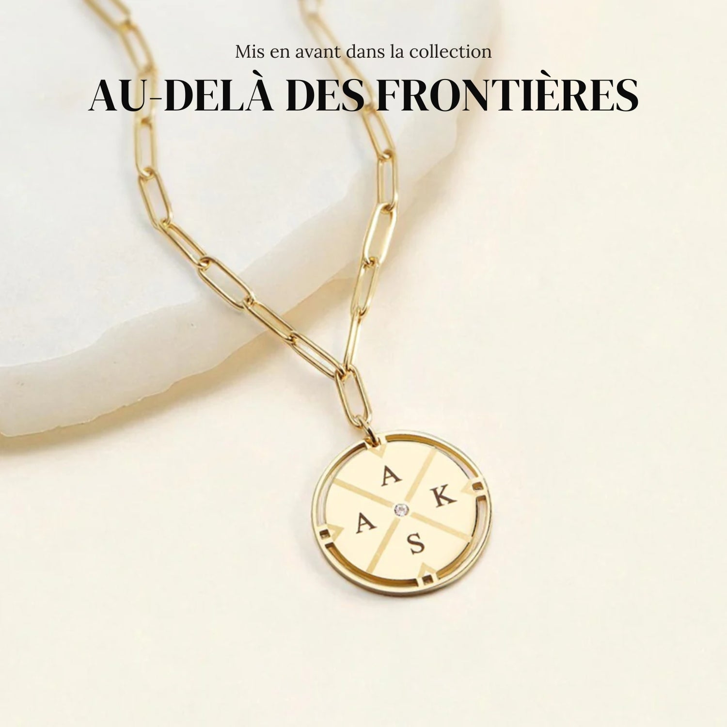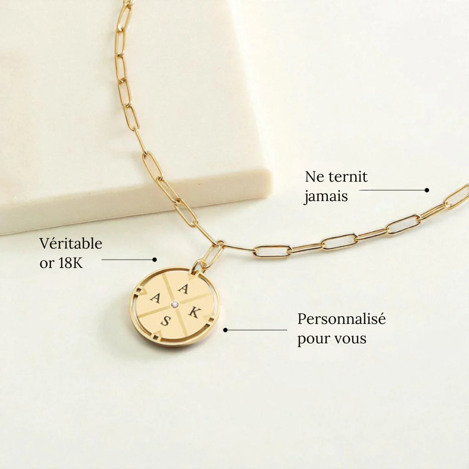 Un collier symbole d’aventure et de sens. Le pendentif boussole personnalisable incarne la direction, les choix et les souvenirs qui guident votre parcours. Un bijou élégant et plein de caractère, à offrir ou à porter comme un talisman personnel.