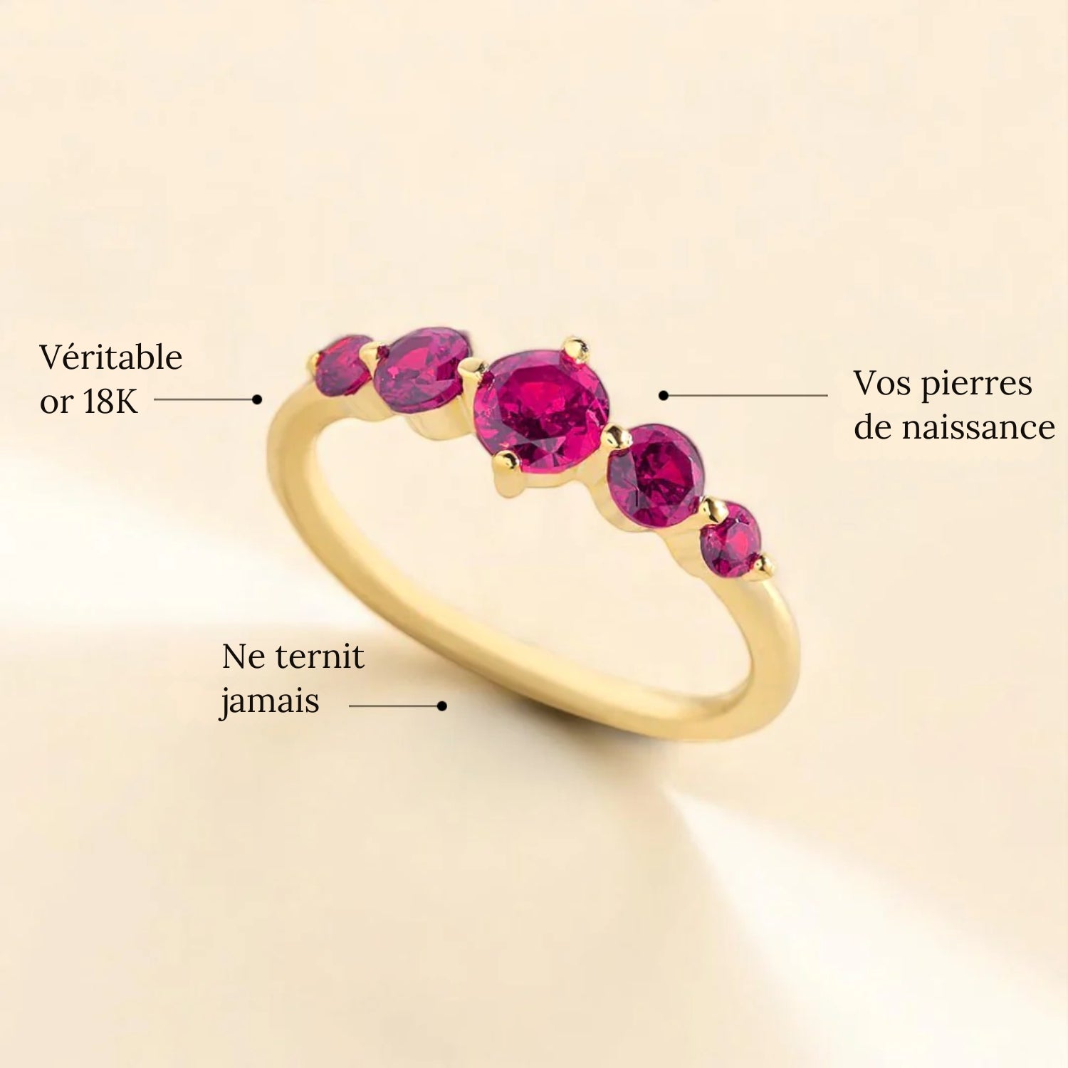 Une bague audacieuse et pleine de sens. Ornée de cinq pierres de naissance éclatantes, elle symbolise les liens et les moments qui comptent. Élégante et colorée, elle attire la lumière et sublime instantanément chaque tenue.
