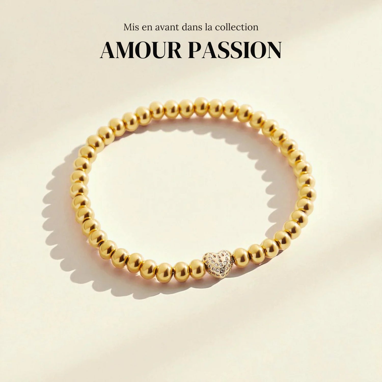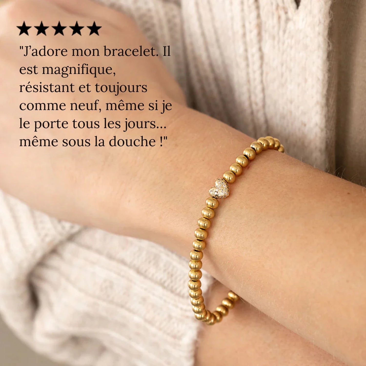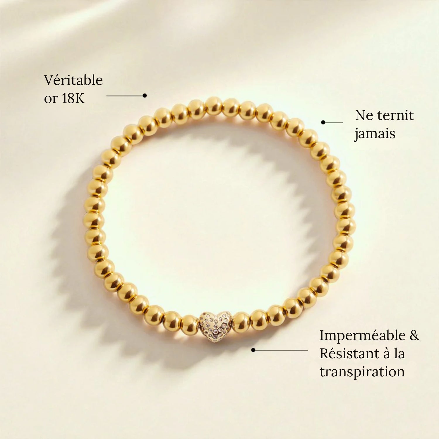 Un bracelet raffiné qui allie élégance et douceur. Composé de perles dorées délicates et orné d’un cœur pavé étincelant, il apporte une touche lumineuse et romantique à votre poignet. Parfait à porter seul ou en accumulation pour un effet chic et moderne.